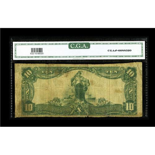 <B>Brunson, SC</B></I> - $10 1902 Plain Back Fr. 632 <B>The First NB</B></I> Ch. # 10832<BR>Four notes are now reported from this very scarce Hampton County bank, and we have now had the pleasure of handling three of them. This is not condition census, having been graded only <B>Very Good-Fine 10</B></I> by CGA, but its rarity should carry it to the level of...<BR><BR><b>Shipping:</b> Coin/Currency (<a target="_blank" href="http://www.heritageauctions.com/common/shipping.php">view shipping information</a>)
