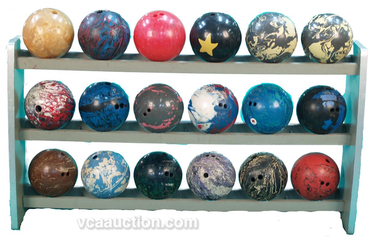 Brunswick 18 Bowling Ball Rack w/ 18 Very Colorful Bowling Balls