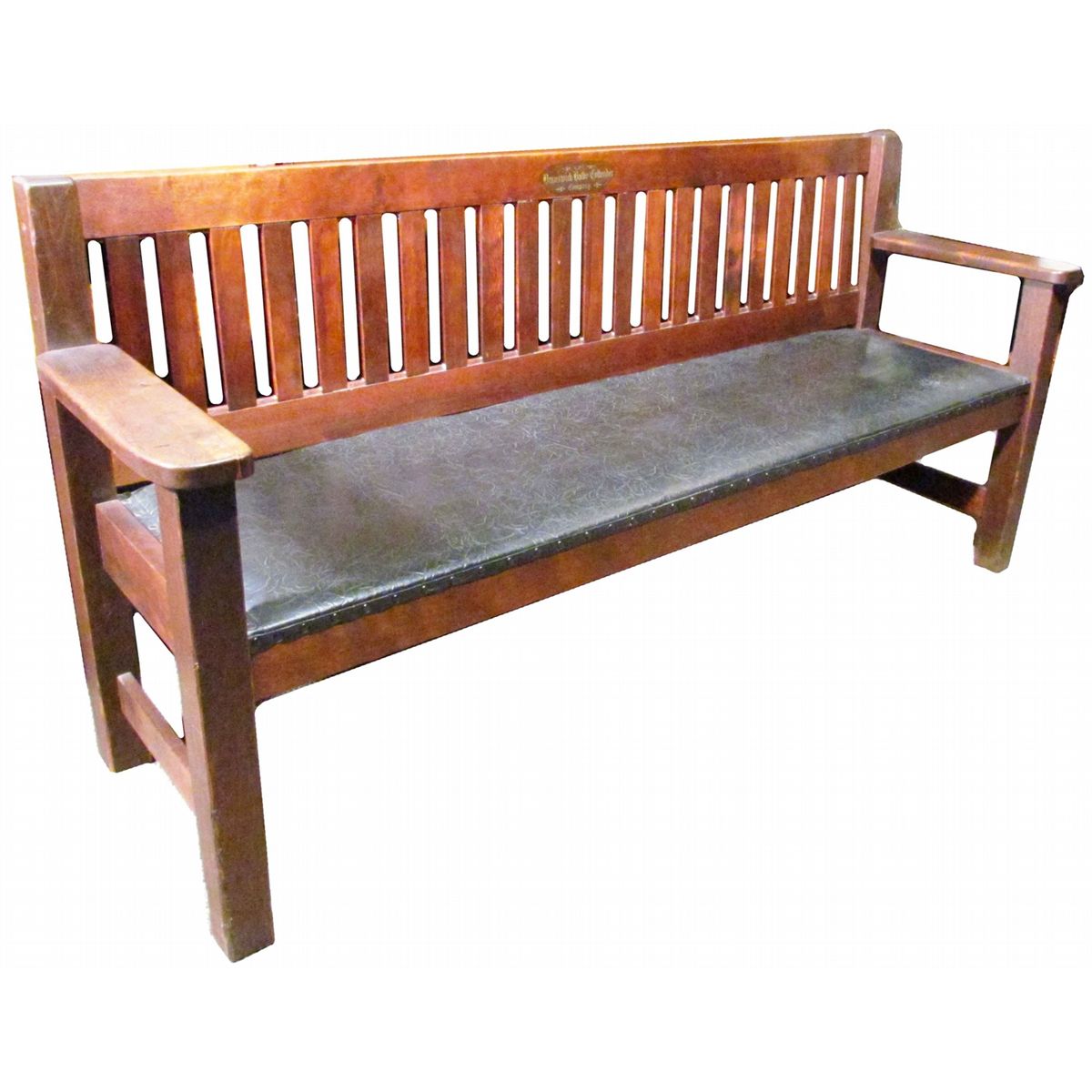Brunswick Balke-Collender Company Bench. Pool hall bench. Mahogany and leather. Excellent condition with original decal. 74 X 35 1/2 X 21 inches.
