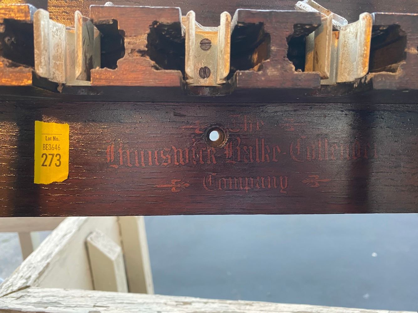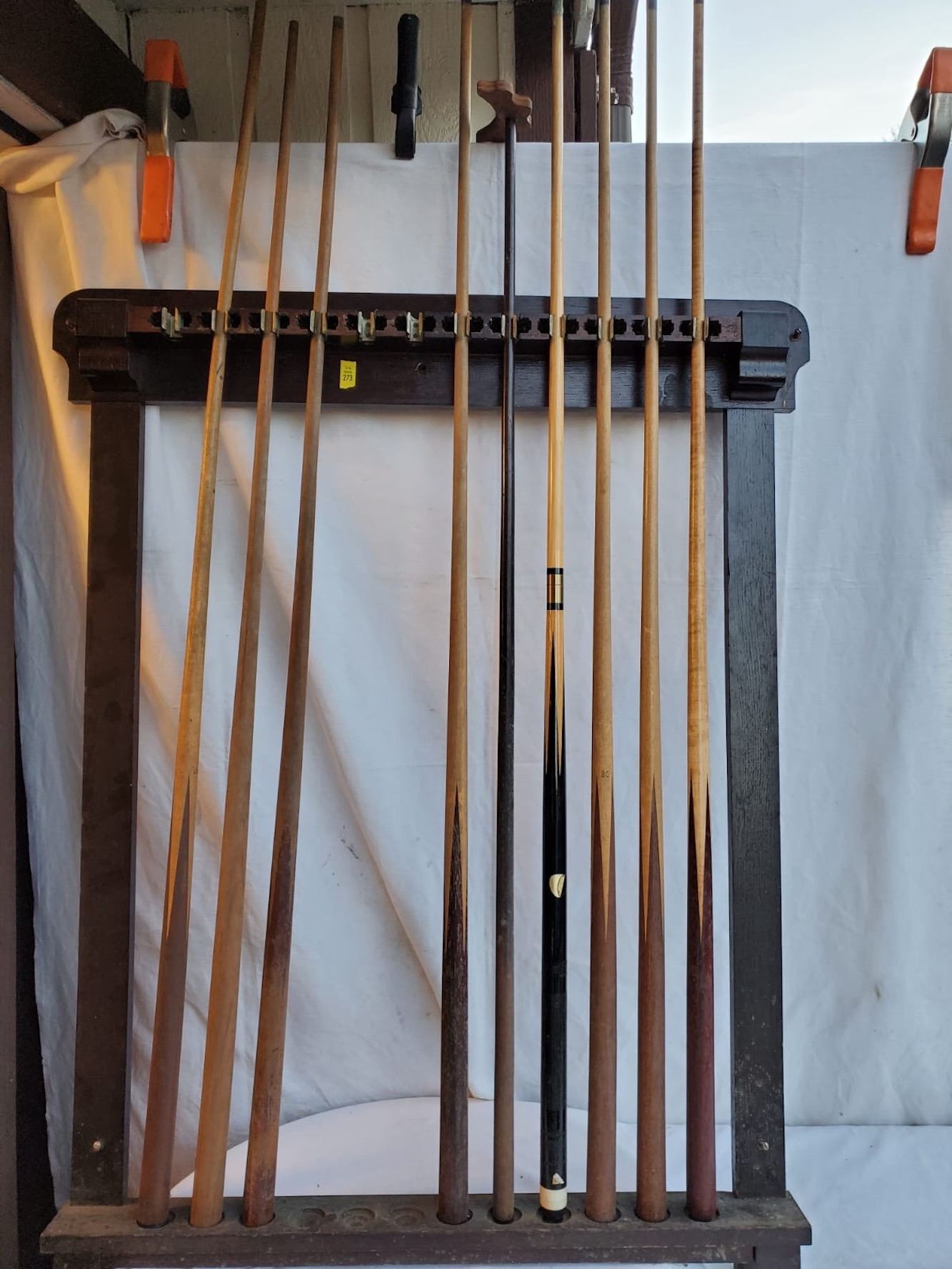 Vintage Brunswick-Balke-Collender Pool Cue Rack and pool cues