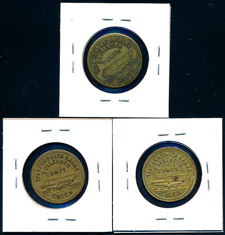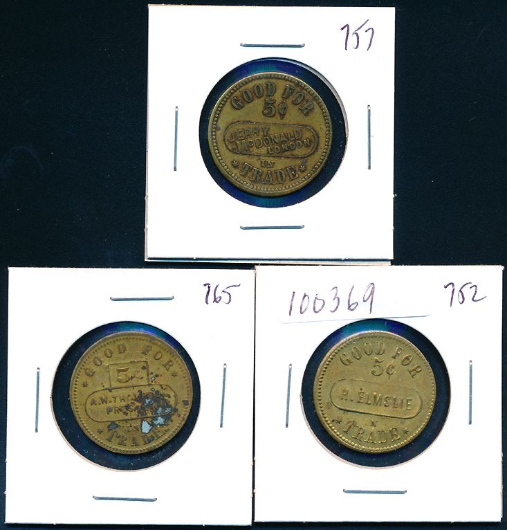 Brunswick Balke Brass Trio: H. Elmslie, Br.752, ??, AU, couple spots; Jerry McDonald, Br.757, ??, VF; A.W. Thompson, Br.765, ??, EF, but badly corrosded obverse; scarcer trio