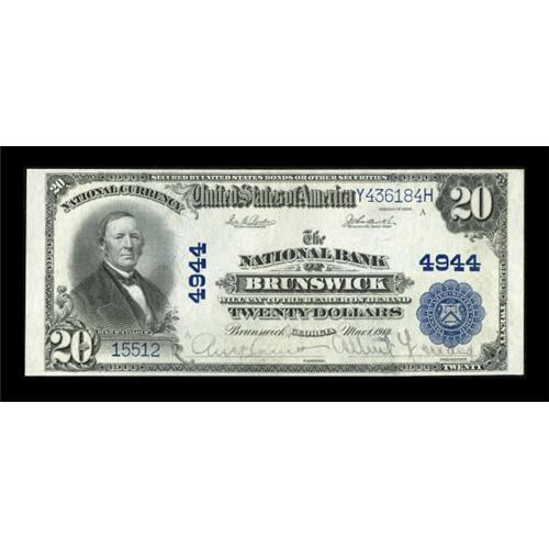 <B>Brunswick, GA</B></I> - $20 1902 Plain Back Fr. 657 <B>The NB of Brunswick</B></I> Ch. # 4944<BR> A lovely note with wide margins and vivid colors, far nicer in appearance than most notes from this state. <B>About Uncirculated.</B></I> <BR><BR><b>Shipping:</b> Coins & Currency (<a target="_blank" href="http://www.heritageauctions.com/common/shipping.php">view shipping information</a>)