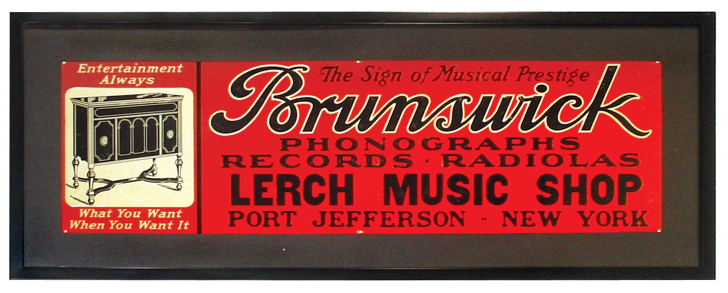 Brunswick Phonographs embossed metal sign from Lerch Music Shop, litho by American Art Works-Coshocton, O., great color & Exc cond, framed under glass, 17"H x 41"W.