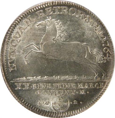 2/3 Thaler 1764 IDB PCGS MS-62. A strongly lustrous piece with light golden toning