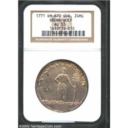 <TABLE cellSpacing=0 cellPadding=0 width="100%" bgColor=#000000 border=0><TBODY> <TR><TD width="100%"><TABLE cellSpacing=1 cellPadding=3 width="100%" border=0><TBODY><TR><TD width="100%" bgColor=#79735c><FONT face=arial color=#ffffff size=3><B>Description</B> </FONT></TD></TR><TR><TD width="100%" bgColor=#ffffff><FONT face=arial size=2><B>Brunswick-Wolfenbuttel. Karl I 24 Mariengroschen 1771IAP</B></I> Wildman/Date and value, KM870, AU53 NGC. </FONT></TD></TR></TBODY></TABLE></TD></TR></TBODY></TABLE><BR><A name=PricesRealized></A><TABLE cellSpacing=0 cellPadding=0 width="100%" bgColor=#000000 border=0><TBODY><TR><TD width="100%"><TABLE cellSpacing=1 cellPadding=3 width="100%" border=0><TBODY><TR><TD width="100%" bgColor=#79735c><A name=PR><FONT face=arial color=#ffffff size=3><B>Previous Prices from Heritage Auctions</B> </FONT></A></TD></TR><TR><TD bgColor=#f6f6ed>No Prior Data Recorded </TD></TR><TR><TD bgColor=#ffffff><FONT face=arial size=1 ?>PLEASE NOTE: All prices realized reflect the final hammer price PLUS the buyer's premium in auctions that charge a buyer's premium. Each item has a notation at the top of the listing indicating whether that lot included a buyer's premium. Example: A item that sells with a final hammer price of $100 and a 20% buyer's premium will display with a price realized of $120. All information listed is intended to be as accurate as possible, but errors are possible. Please use this guide carefully and inform us of any inaccuracies. </FONT></TD></TR></TBODY></TABLE></TD></TR></TBODY></TABLE><BR><TABLE cellSpacing=0 cellPadding=0 width="100%" bgColor=#000000 border=0><TBODY><TR><TD width="100%"><TABLE cellSpacing=1 cellPadding=3 width="100%" border=0><TBODY><TR><TD width="100%" bgColor=#79735c colSpan=6><FONT face=arial color=#ffffff size=3><B>Price Guide*</B> </FONT></TD></TR><TR bgColor=#f6f6ed><TD align=middle><B>Grade</B> </TD><TD align=middle><B>Coin World<BR>(Trends)</B> </TD><TD align=middle><B>Numismedia<BR>Retail</B> </TD><TD align=middle><B>Numismedia<BR>Wholesale</B> </TD><TD align=middle><B>Coin<BR>Universe</B> </TD><TD align=middle><B>Heritage<BR>Value Index</B> </TD></TR><TR bgColor=#ffffff><TD colSpan=6><FONT size=1>*All information listed is intended to be as accurate as possible, but errors are possible. No item may be returned or refused based on this information which is provided as a service to our customers. You should contact each pricing source directly to determine the accuracy of this information. </FONT></TD></TR></TBODY></TABLE></TD></TR></TBODY></TABLE><BR><TABLE cellSpacing=0 cellPadding=0 width="100%" bgColor=#000000 border=0><TBODY><TR><TD width="100%"><TABLE cellSpacing=1 cellPadding=3 width="100%" border=0><TBODY><TR><TD width="100%" bgColor=#79735c><FONT face=arial color=#ffffff size=3><B>Population Guide</B> </FONT></TD></TR><TR bgColor=#ffffff> Important notice: Heritage usually auctions material at the rate of 200-250 lots per hour. On some occasions eBay Live bid software or the Internet may not be able to keep up with the pace of the auction. We recommend placing a realistic absentee bid now as insurance to avoid disappointment. Occasionally the auctioneer may eliminate or reject an eBay Live bid, and the auctioneer may also reopen a lot after the close of the eBay live bidding (usually because we missed an audience bid), and may reject your bid even if it shows you as the winning bidder. By bidding via eBay Live, you agree that Heritage may award the lot to another bidder at its sole discretion under the circumstances described above or any other reasonable circumstances. Also please note that all Heritage lots purchased through eBay Live carry a 20% Buyer's Premium. Please make sure you read the Terms and Conditions before you bid.</TD></TR></TBODY></TABLE></TD></TR></TBODY></TABLE>
