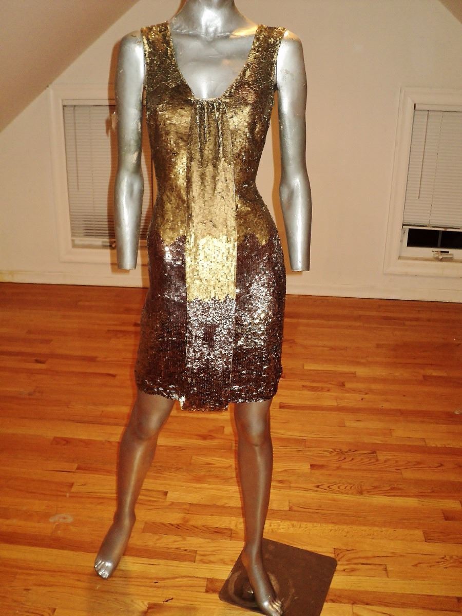 Stunning Antique pewter and Gold Mini Payette Mini Brubya Couture dress.Mini & Medium Payette(Sequins)and a front Tie wing That is absolutely Smashing. This one Belongs on the Runways. In very good Vintage Condition really a Collectors Dream Measures:Bust-34\"Waist-29\""Hip-38\"" It is Between a Small/MediumSmall Frame"