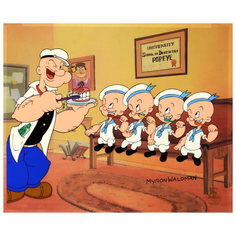 "Brushing 101" is a limited edition hand inked and hand painted animation cel with background, numbered and hand signed by Myron Waldman (1908-2006). Includes Certificate of Authenticity! Measures approx. 14" x 12" (background), 12" x 9" (cel).