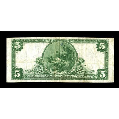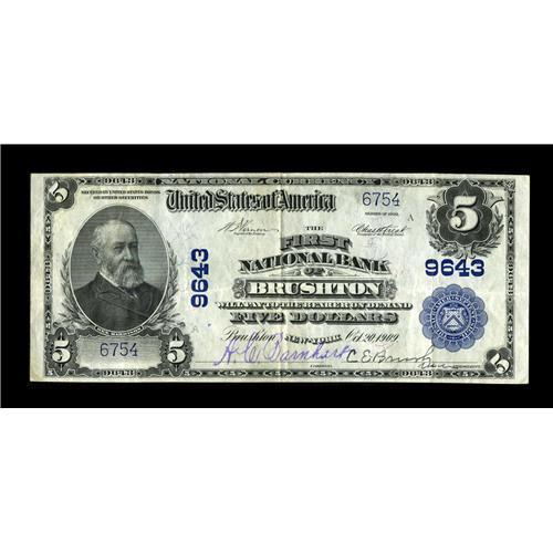 <B>Brushton, NY</B></I> - $5 1902 Plain Back Fr. 600 <B>The First NB</B></I> Ch. # 9643<BR>Just four large notes (along with two small) make up the entire census from this tiny Franklin County institution, the only issuer here. This is just a peach of a note, with everything a collector could desire, including bright white paper, a vivid blue overprint, and lovely two color signatures.It's by far the finest note of any kind known from the bank, although, interestingly, it's listed in the census as "Very Good"...another peril in relying on thirty year old Donlon grades of "Very Good," which in many cases he assigned to any Blue Seal which exhibited the slightest degree of circulation. <B>Very Fine+,</B></I> and signed as a bonus by C.E. Brush as Vice President, scion of the family which settled this small community in 1835.<BR><BR><b>Shipping:</b> Coin/Currency (<a target="_blank" href="http://www.heritageauctions.com/common/shipping.php">view shipping information</a>)