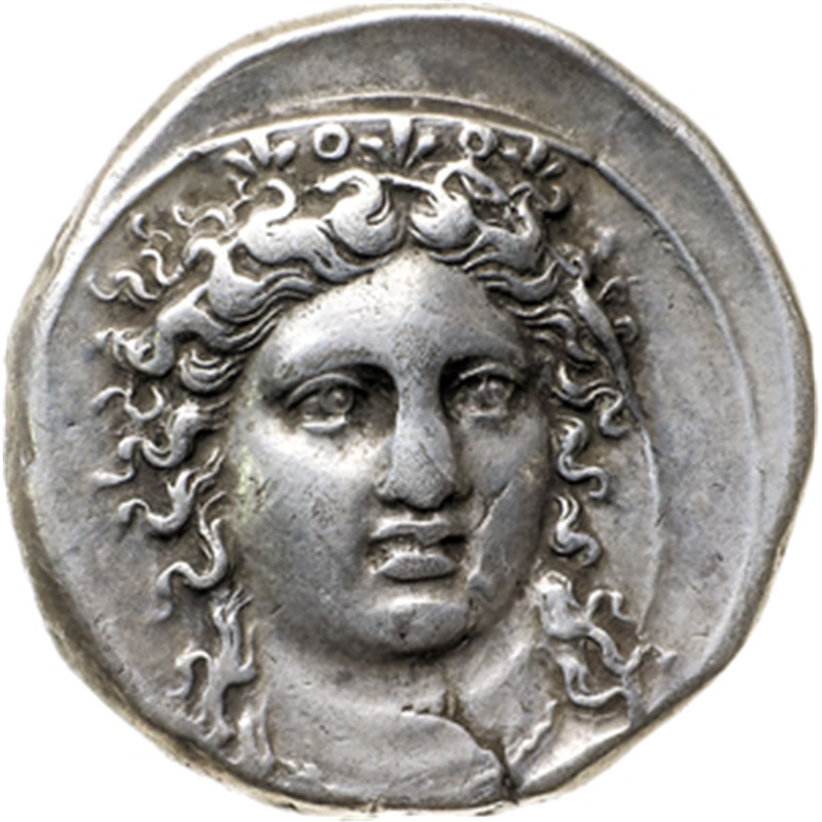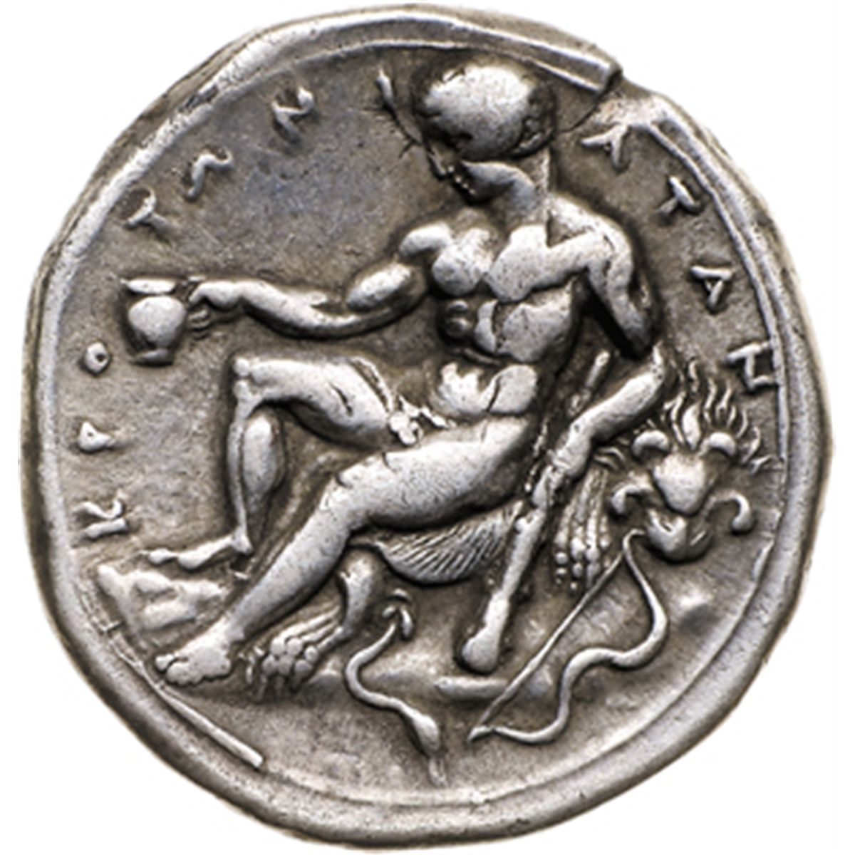 Mondo Greco. Italia Greca. Bruttium, Crotone. Nomos, 400-325 a.C. D/ Testa di Hera Lakinia di fronte, con il volto tre quarti a destra, che indossa stephane. R/ KPOTŒ©NIATAN. Giovane Eracle nudo, seduto a sinistra su roccia coperta da pelle di leone, tiene una coppa nella mano destra protesa e una clava nella sinistra. A terra, un arco. SNG ANS 371. HN(Italy) 2159. AG. g. 7.82 mm. 22.00 RRR. Bel BB+. Di grande raritv† e bellezza.