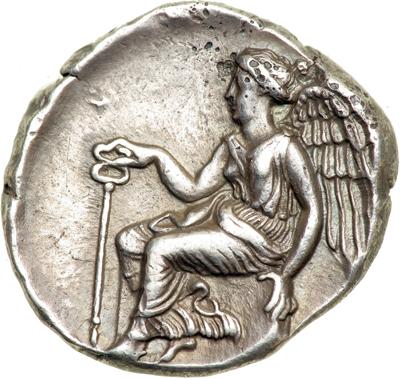 Bruttium, Terina, c. 410-400 BC. AR Stater (7.7 g). Head of Nymph left with hair bound with sphendone from which loose ends escape behind; in lower right field, gamma. Reverse: Winged Victory seated left on cippus with base shown in perspective; she holds a caduceus in her right hand. Holloway-Jenkins 59 (this coin); Regling 59. Well-detailed and beautifully struck; Choice Very Fine.