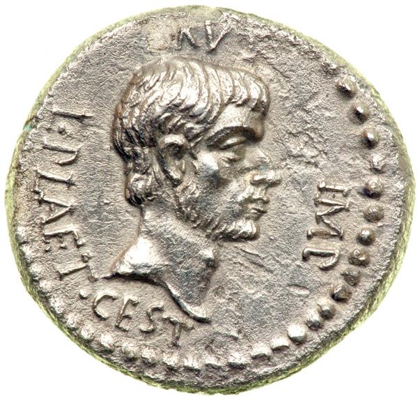 We have an active symbolism pictured on the reverse of this coin: the bloodied daggers wielded by Brutus and his cohorts in a futile effort to regain Roman liberty (pileus, or liberty cap).