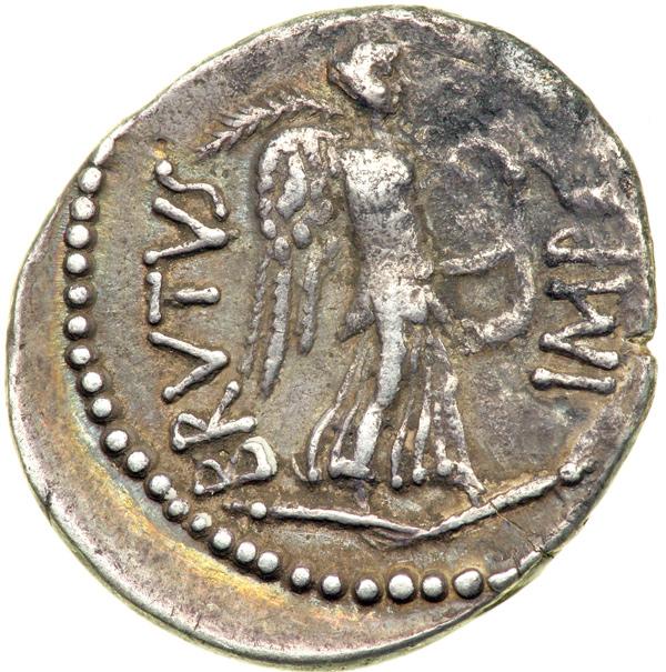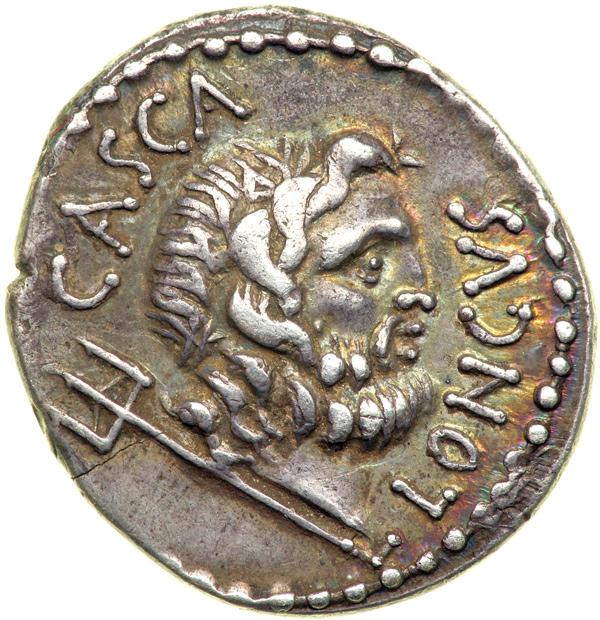 A favorite issue of collectors, this denarius seems to possess an appropriate return to Republican types. The broken spear is likely symbolic of the crushing of Julius Caesar's supposed hunger for complete dictatorial power over Rome .