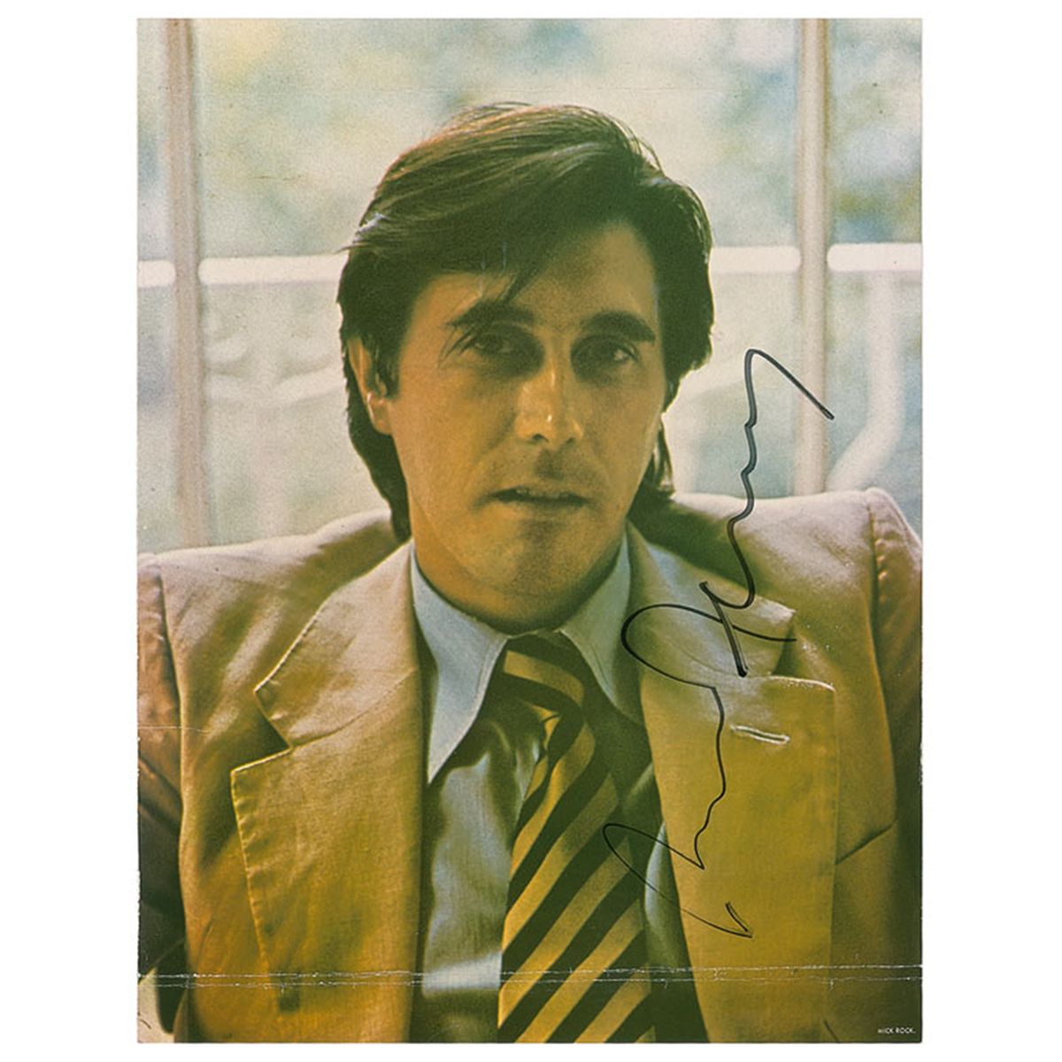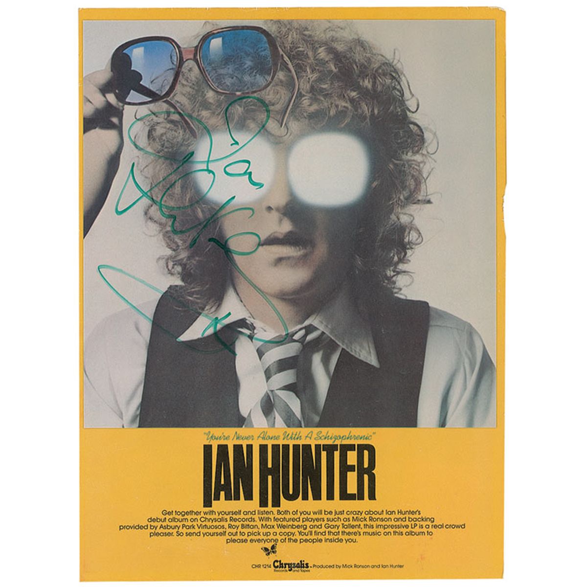 Two color magazine photos, 10 x 12 and 9.5 x 12.75, one a Chrysalis promotional poster for You’re Never Alone with a Schizophrenic, signed in green felt tip by Hunter, and the other a head-and-shoulders shot of Ferry in a suit and tie, signed vertically in black felt tip. In very good condition, with scattered light creases and some small edge tears to Hunter’s poster, and a trivial crease and two horizontal folds, one at the top and bottom edges, of Ferry’s poster.