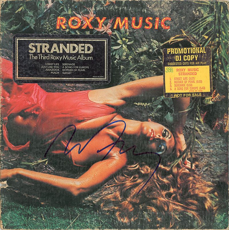 Promotional DJ copy of Roxy Music’s Stranded album signed on the front cover in blue felt tip. In very good condition, with two promotional labels affixed to front cover, a discount cut to spine, album impression to covers, small separations along hinge, and scattered wear and rubbing to covers. The record is included.