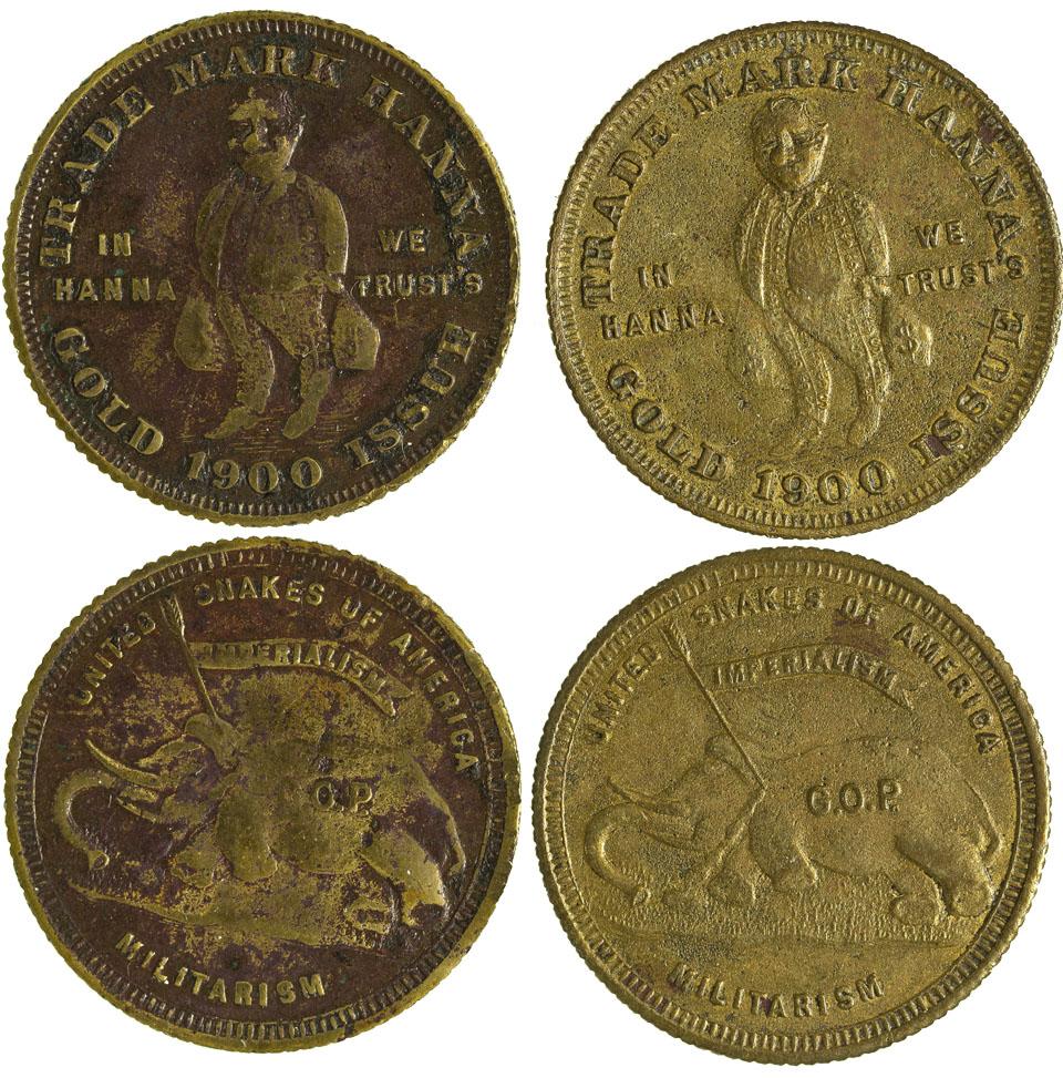 Obverse: The figure of a short-statured fat man dressed in conventional sack suit of checkered fabric, each square enclosing a dollar sign. ($) The man carrying in each hand a bulging money bag inscribed with a dollar sign. Above, in semi-circle, "Trade Mark Hanna," in field at left "In Hanna We Trust" below "Gold Issue" separated with 1900. Reverse: a fallen elephant in distress, struck by an arrow back of ear. GOP on elephant's back from the arrow stem flows a pennant inscribed "Imperialism," above United Snakes of America, below "Militarism". Denticulated borders, coarse edge reeding, bronze, 27mm. Two tokens in this lot one well struck, very fine, one worn, very good condition.