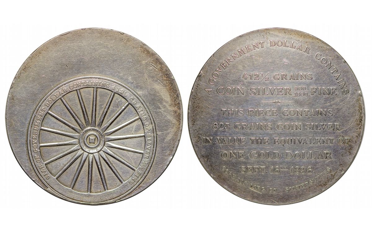 1896 Large 50mm fine silver coin, manufactured by Gorham Mfg. Silversmiths. The embossing on the obverse reads " A Government Dollar Contains 412 1/2 Grains Coin Silver 900/1000 Fine. This Piece Contains 823 Grains Coin Silver in Value The Equivalent of One Gold Dollar." The reverse shows a smaller radial wheel, around which it reads "The Size of a Government Dollar…" with the verbiage above. The condition of this coin is excellent, and this piece is quite rare. - HKA#65272