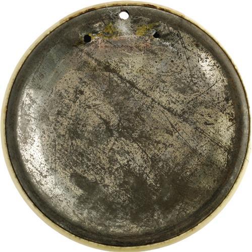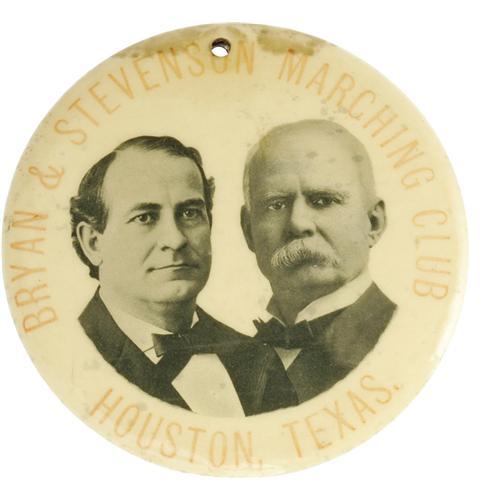<B>Bryan-Stevenson "Marching Club" 4" Jugate Button from Houston, Texas.</B></I> This giant jugate has to be one of the top Bryan-Stevenson items, and should be of special interest to Texas collectors. While it certainly has some condition issues, it is still in display-worthy condition. The red lettering has faded evenly, and there are scattered small, light fox marks, and a more significant area of staining along the top edge as shown. Holed as made for suspension. Original metal back. <I>From the Norman Loewenstern Collection.</B></I>