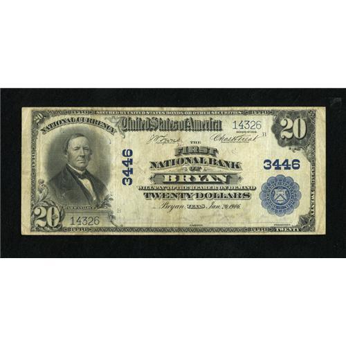 <B>Bryan, TX</B></I> - $20 1902 Plain Back Fr. 651 <B>The First NB</B></I> Ch. # 3446<BR>This is a scarce large size national from Aggieland. Pleasing <B>Fine+++.</B></I><BR><BR><b>Shipping:</b> Coins & Currency (<a target="_blank" href="http://www.heritageauctions.com/common/shipping.php">view shipping information</a>)