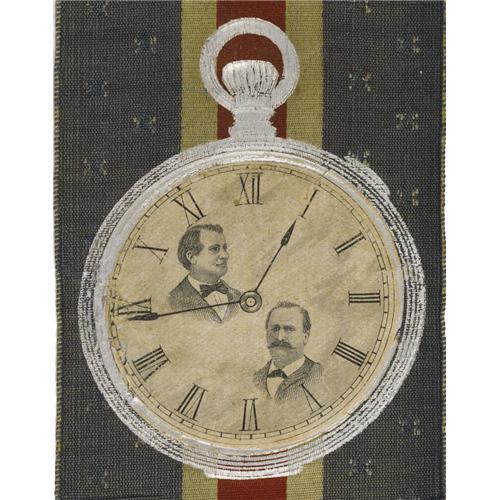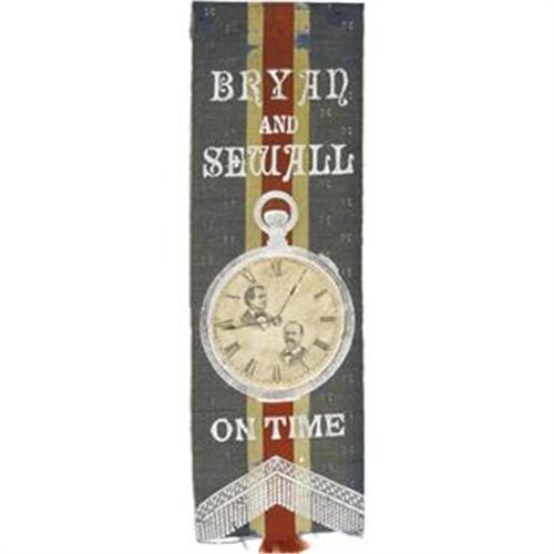 <B>Bryan and Sewall: A Rare 1896 Jugate Ribbon With "16 to 1" Clockface.</B></I> "16 to 1" was, of course, the rallying cry for Bryan's first presidential run. It referred to the ratio of silver to gold desired by the silver-producing western states where Bryan had a strong following.<BR>Various campaign items were produced employing the device of a clockface, with the time set at 16 minutes to 1:00. This is one of the nicest- and rarest. We can't recall having seen more than couple of others over the years. Condition is nice, with some light, general "aging" which detracts minimally. From the Norman Loewenstern Collection.<BR><BR><b>Shipping:</b> Small Collectibles (<a target="_blank" href="http://www.heritageauctions.com/common/shipping.php">view shipping information</a>)