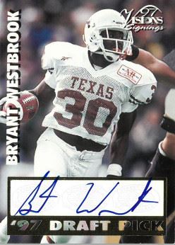 Bryant Westbrook played college football at the University of Texas at Austin, where he was named the starting right cornerback midway through his freshman season, tallying 39 tackles, 7 passes defensed and 2 interceptions. The next year, he was moved to the left side after the fifth game, making 30 tackles, 3 passes defensed and 4 interceptions.Westbrook was known for making powerful tackles that would intimidate his opponents. Bryant Westbrook has hand autographed this 1997 Draft Pick Scoreboard Football Card. Certificate of Authenticity from The Score Board