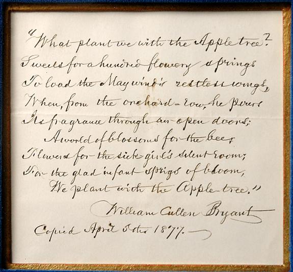 Bryant, William Cullen - AQS (1794-1878) Poet, journalist, and editor. Autograph quotation signed, 4¼ x 4½", n.p., Apr. 5, 1877. The third stanza of the poem "The Planting of the Apple-Tree," beginning "What plant we with the Apple tree? Sweets for a hundred flowery springsā¦." Fine. Matted with a small portrait of Bryant and framed to an overall size of 19½ x 15½ in. With a COA from the late autograph dealer Charles Hamilton on the verso.