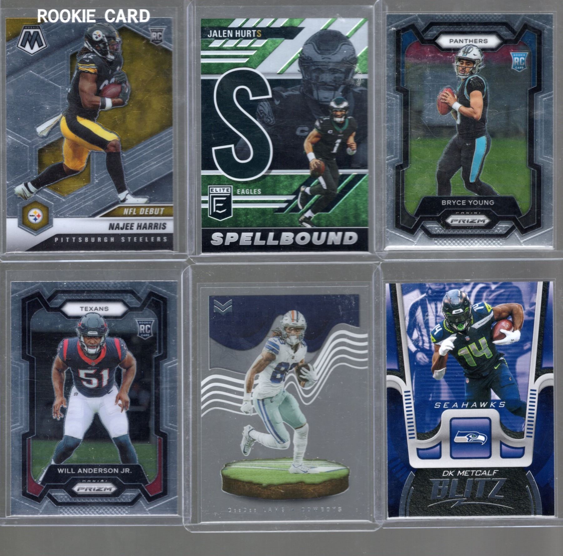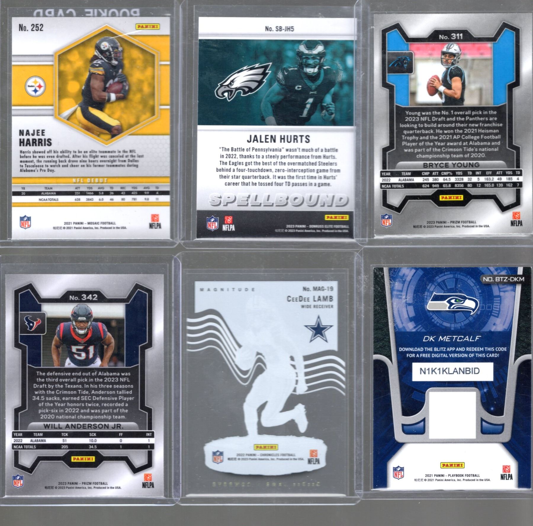 Bryce Young RC Prizm, Jalen Hurts Elite Extra Edition Spellbound '23, Najee Harris RC Mosaic #252, D.K. Metcalf '21 Playbook Blitz, Cee Dee Lamb '22 Magnitude, & amp; Will Anderson, Jr. RC '23 Prizm #342.
