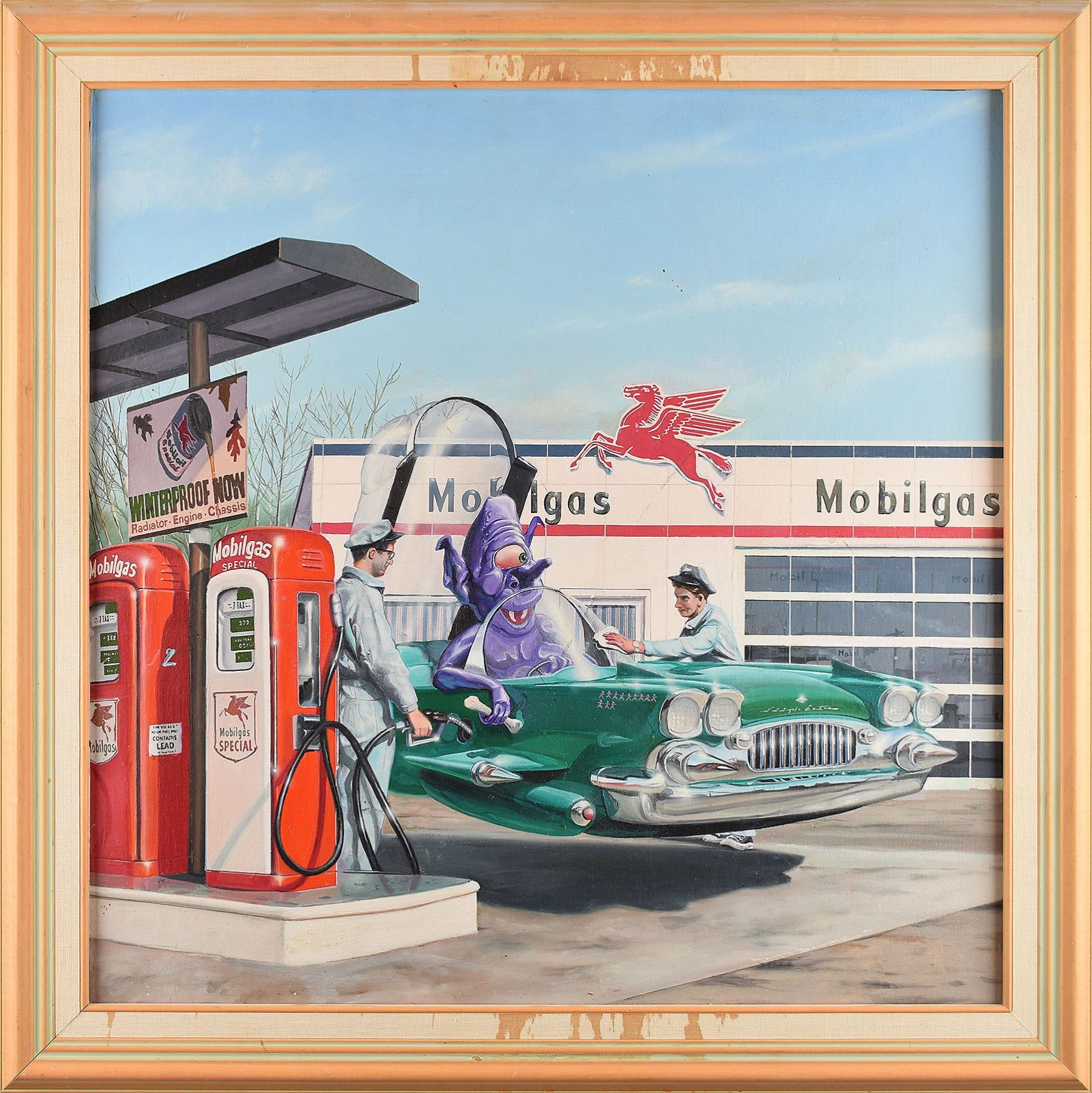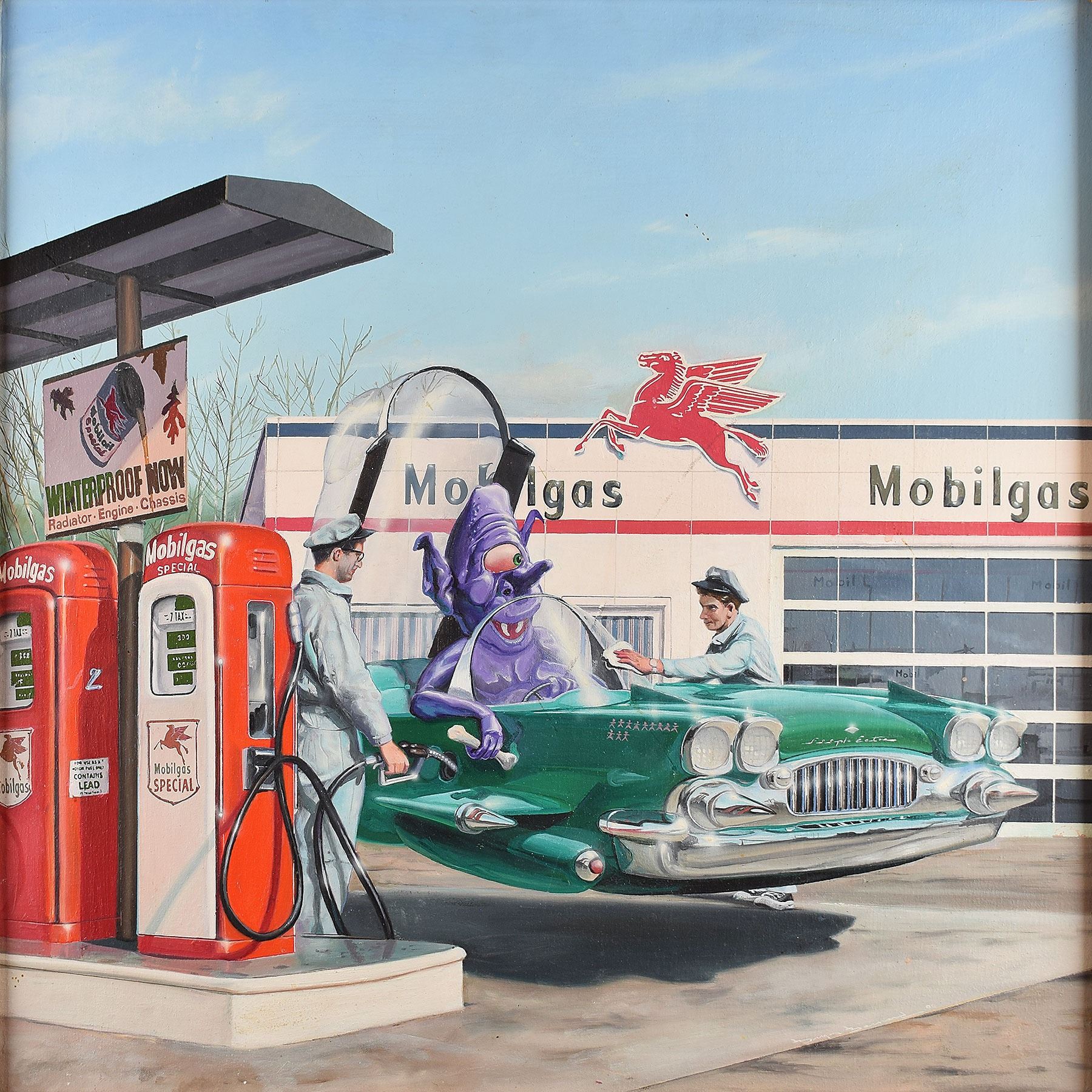 Fantastic original color painting by noted artist Bryn Barnard, entitled 'Tanked,' accomplished in acrylic on a 22.75 x 22.75 sheet of artist board. The painting depicts the famed 'one-eyed, one-horned, flying, purple people eater' alien getting gas for his hovering 'People Eater' vehicle, with the two wary Mobilgas attendants wiping the windshield and pumping gasoline. Signed in the lower right by Barnard, who dates the painting to 1990. Framed without glass to a slightly larger size; frame backing bears an affixed 'Bryn Barnard Illustration' label. In fine condition. This painting was used as artwork for the front cover of the Time Life Music ?compilation album The Rock 'N' Roll Era—Weird, Wild & Wacky. A delightful fusion of science fiction and Americana, with a special nod to Sheb Wooley’s 1958 hit single, ‘Purple People Eater.’