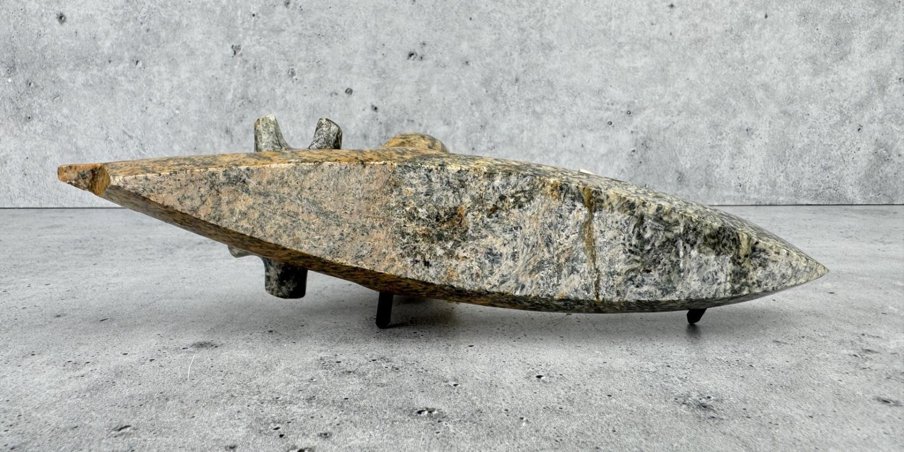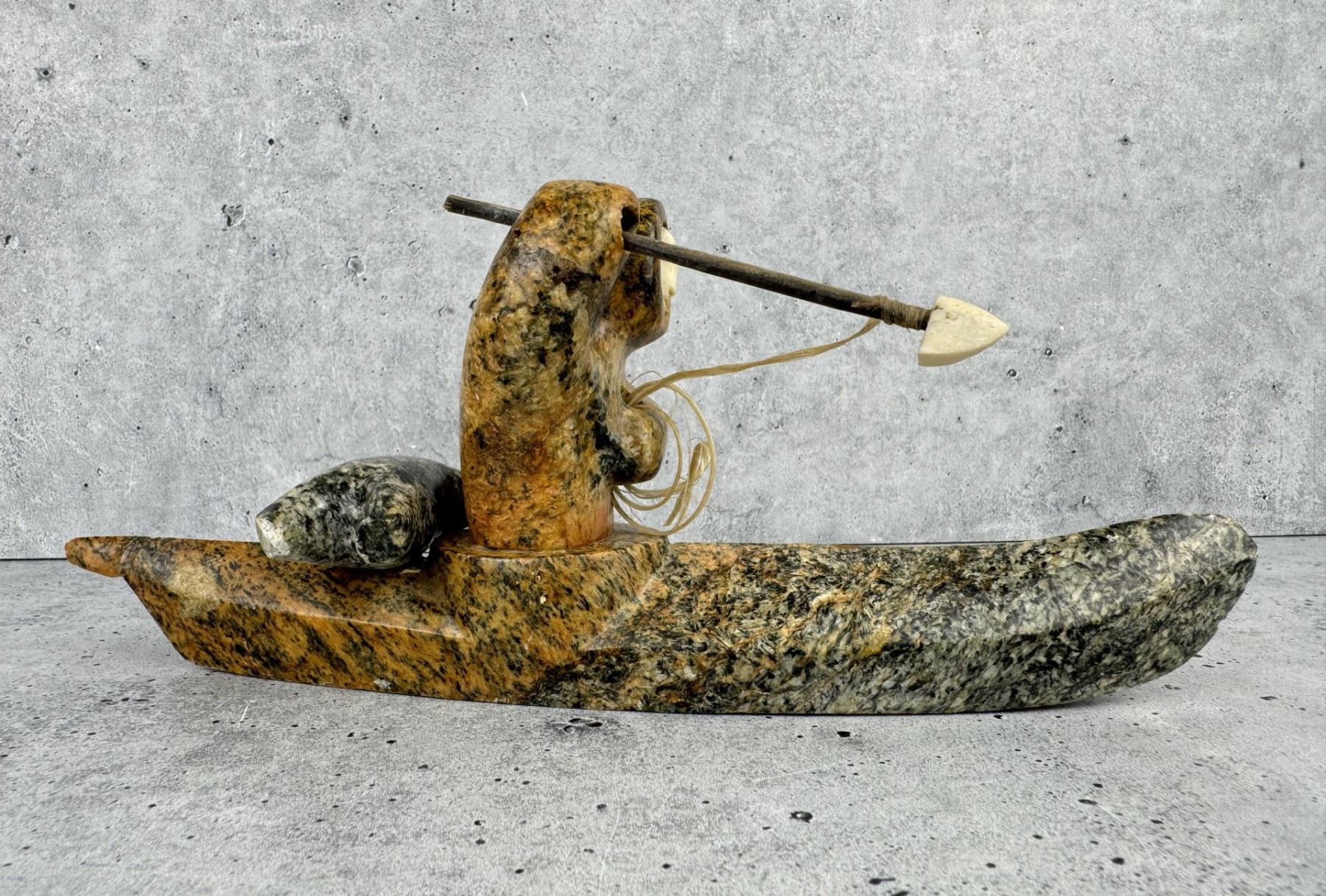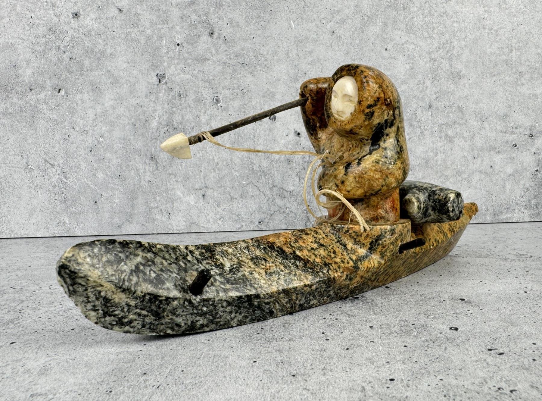 9 1/2" long by 4" high by 2 3/4" wide. Canoe has a couple chips and a repair.