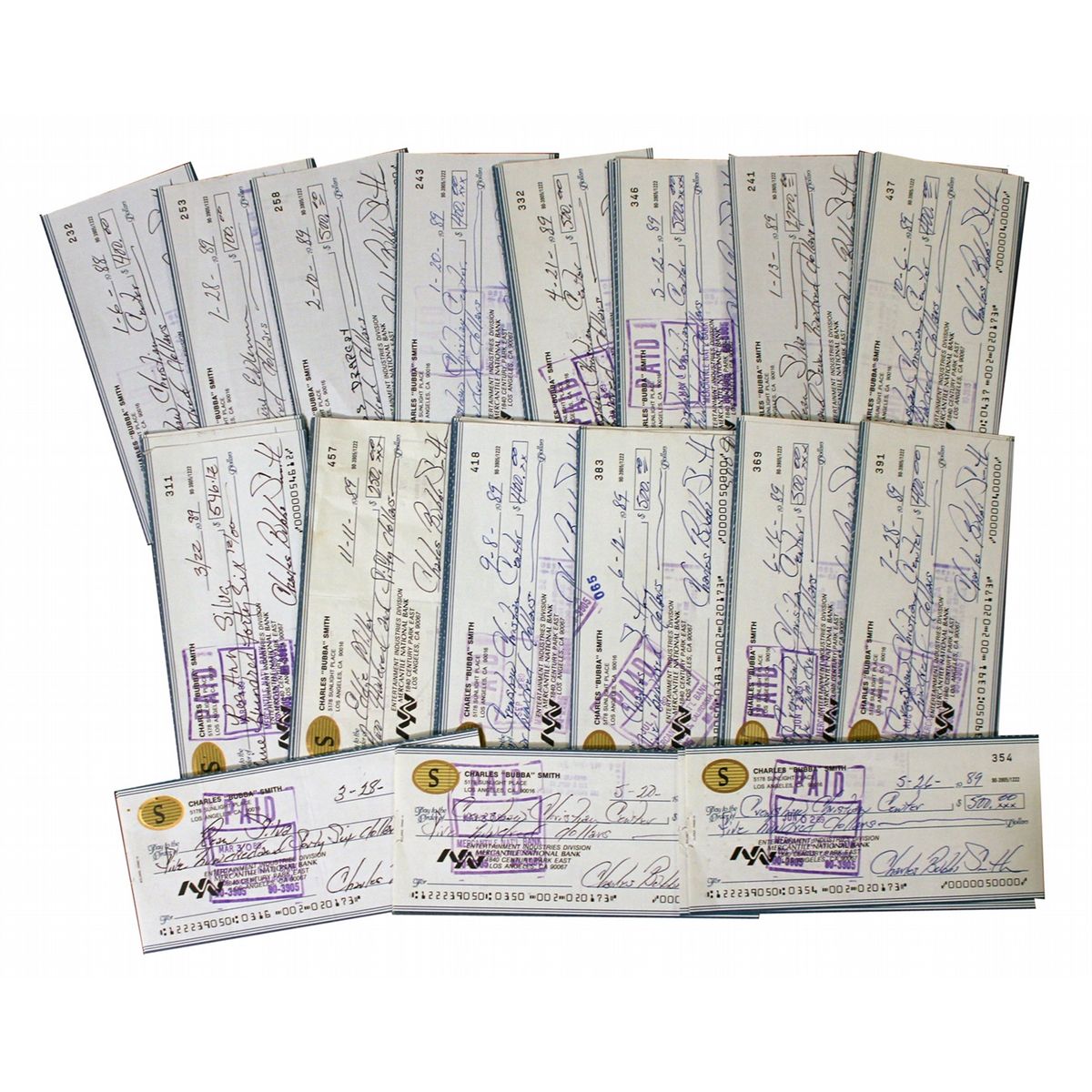 Lot of fifty checks signed by Bubba Smith, ranging in date from 6 January 1988 to 16 December 1989. Each cancelled check is signed by Smith. The checks are written on Smith's personal account, at his Los Angeles address. The 6'' x 2.75'' checks are drawn on Mercantile National Bank of Los Angeles. Stapling or folding to most checks. Overall in very good condition. Accompanied by an LOA from the Trustee of the Bubba Smith Estate.