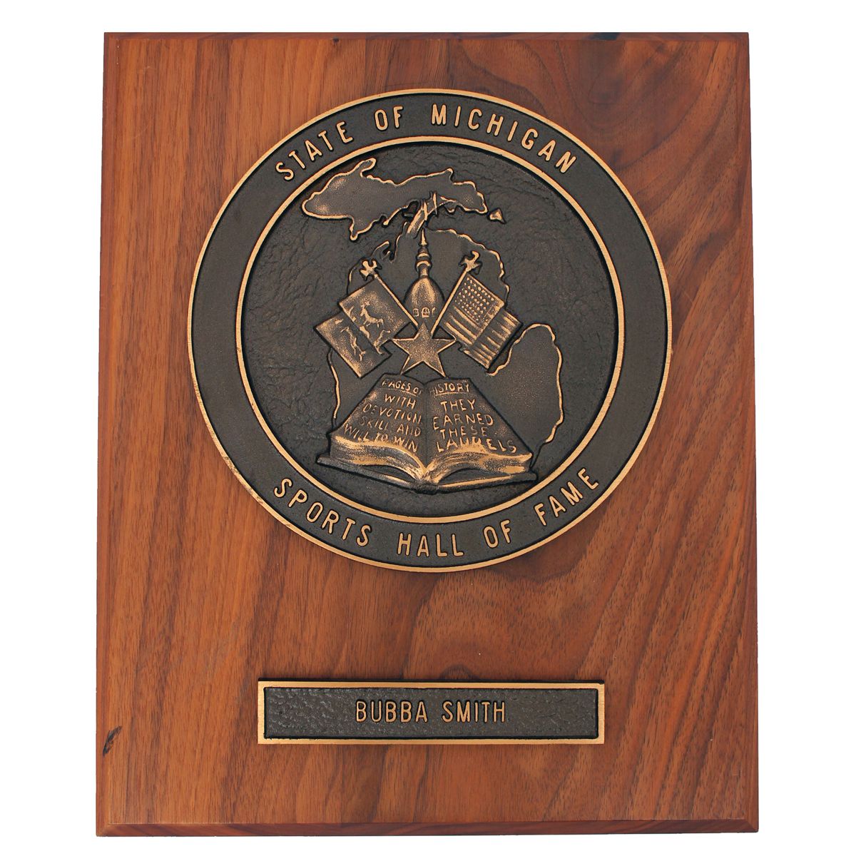 Charles ''Bubba'' Smith State of Michigan Sports Hall of Fame plaque. Smith received the plaque in 1993 when he was inducted into the Michigan Sports Hall of Fame, which honors the ''most influential figures in the history of Michigan athletics.'' Smith started his football career at Michigan State University where he was an All-American and one of only three football players to have his number retired. The 10.5'' x 13'' plaque is in near fine condition. Accompanied by an LOA from the Trustee of the Bubba Smith Estate.