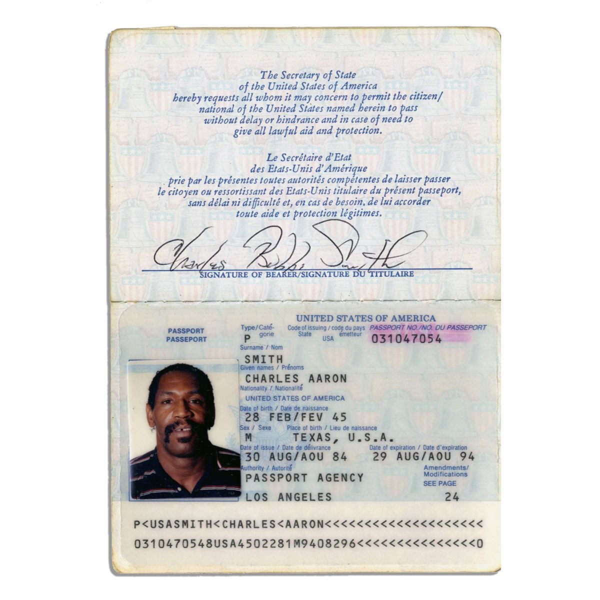 Passport belonging to football great and movie star Bubba Smith, issued 30 August 1984. Smith, whose given name was Charles Aaron, signs as the bearer of the passport using his nickname: ''Charles Bubba Smith''. The Amendments page clarifies: ''The bearer is also known as Bubba Smith''. Passport, measuring 3.5'' x 4.75'', includes Smith's personal information, and French and Japanese entry stamps as well as a Japanese visa. Soiling to cover, else near fine. Accompanied by an LOA from the Trustee of the Bubba Smith Estate.