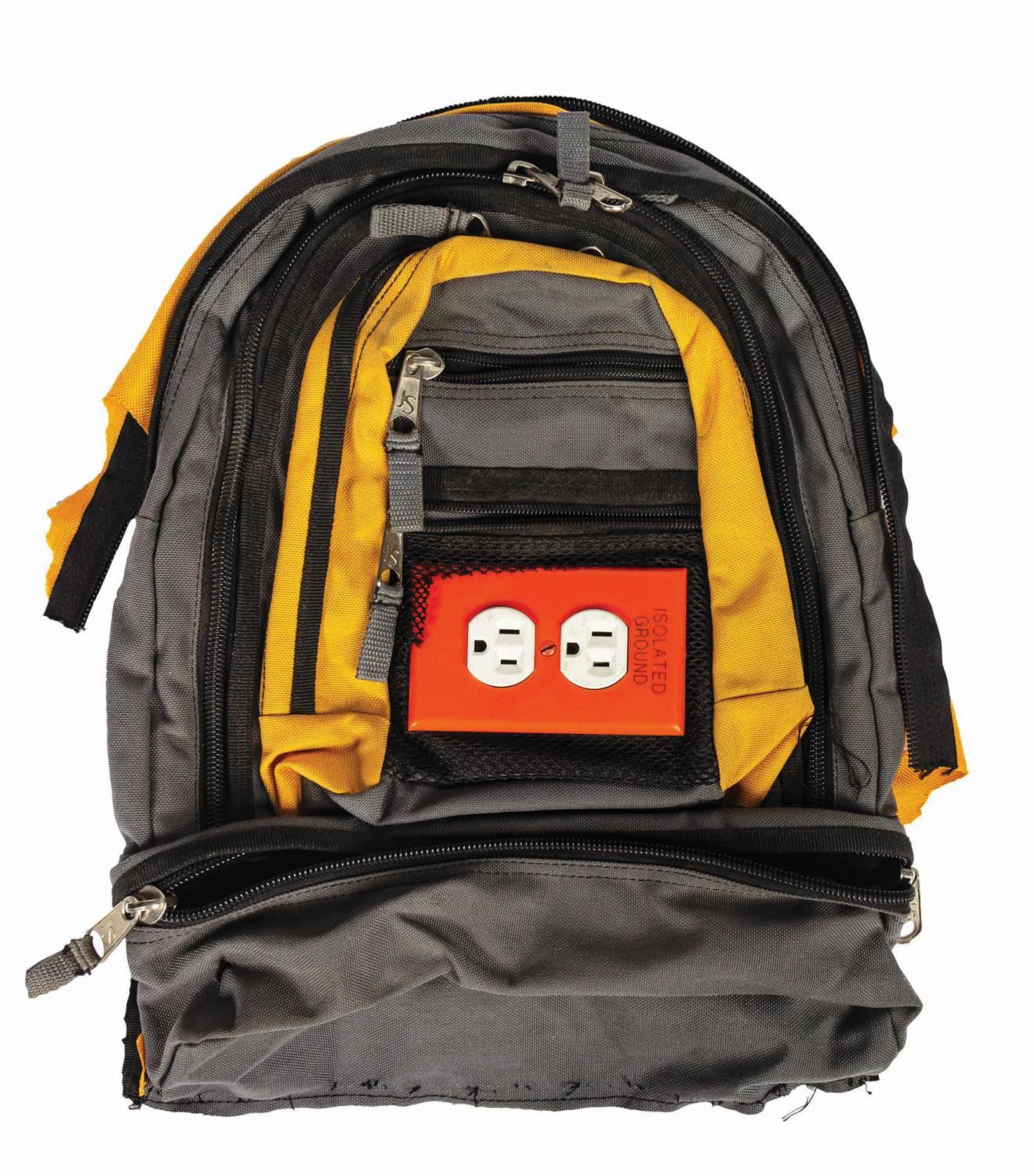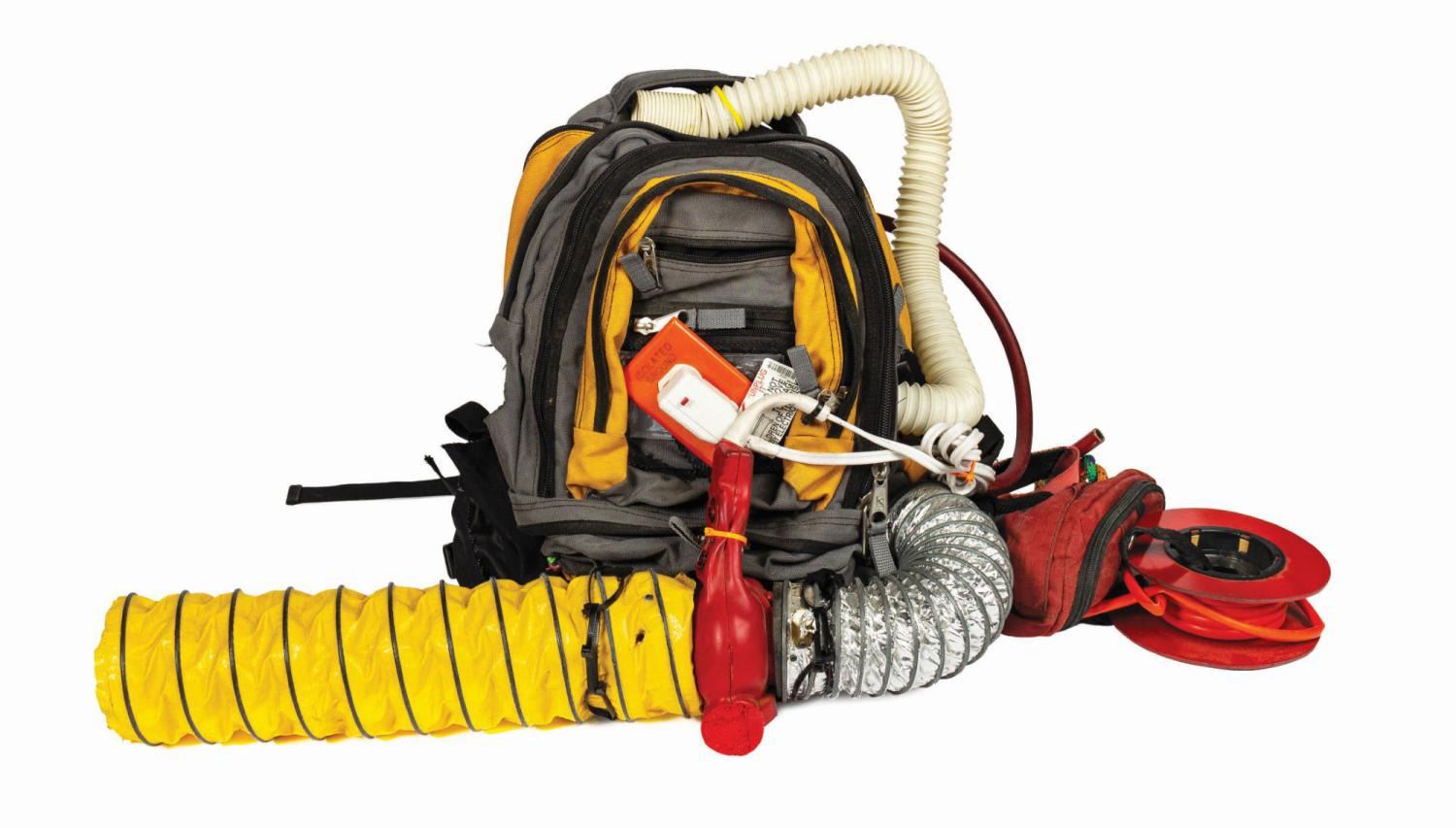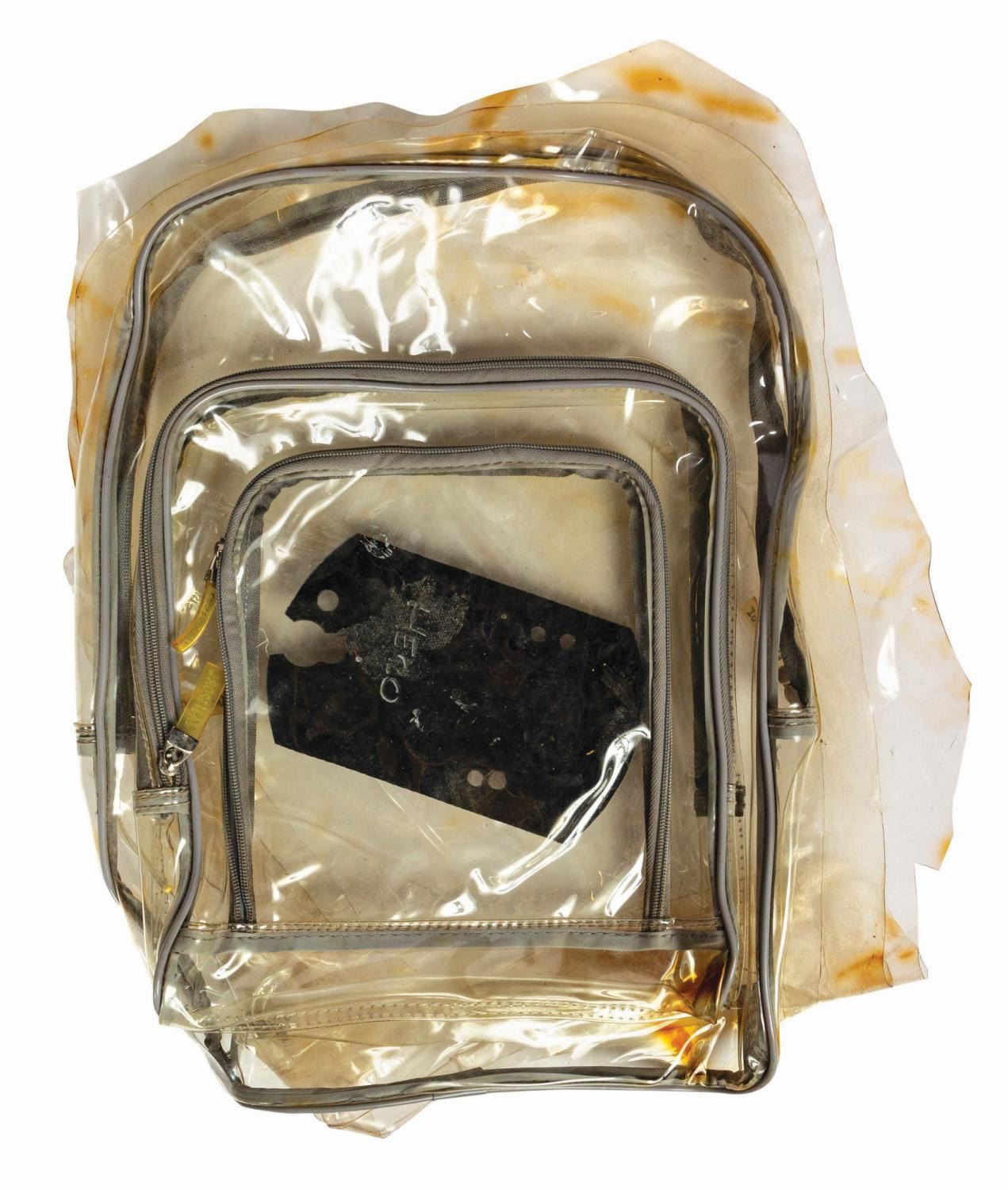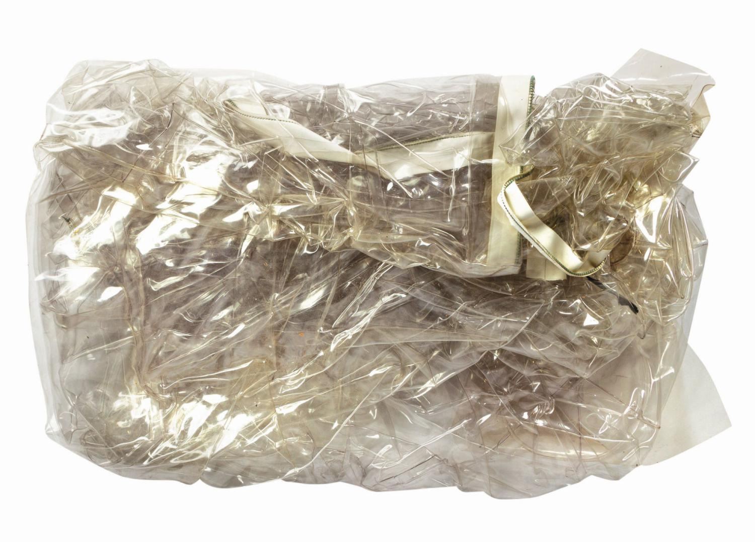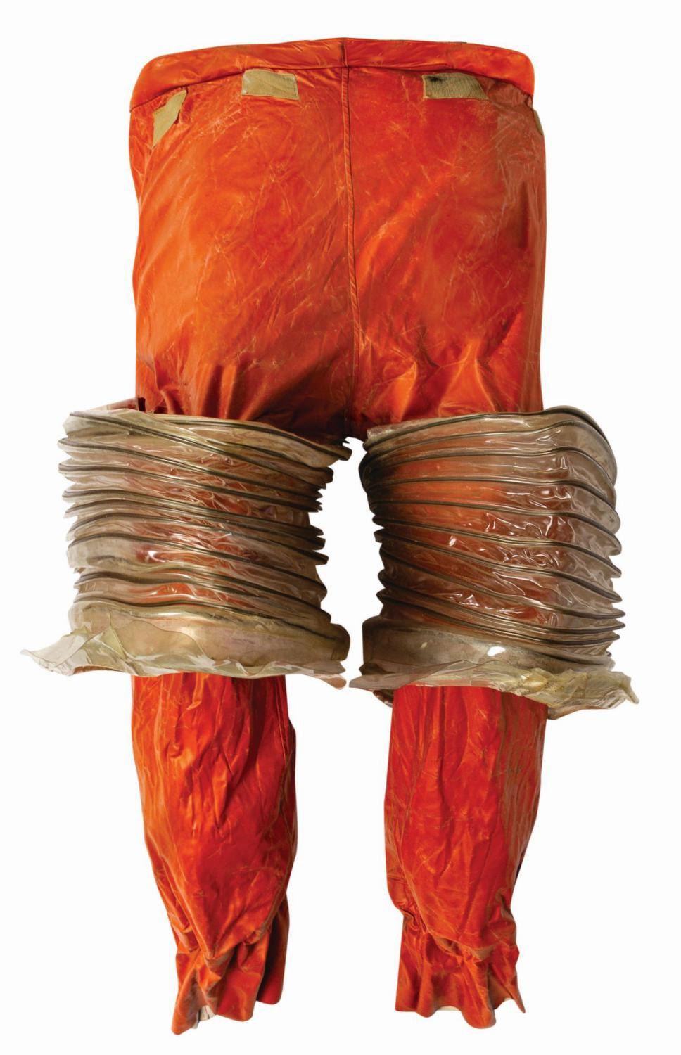 (Touchstone, 2001) A collection of original “Jimmy Livingston” (Jake Gyllenhaal) hero and production used mobile bubble suit components from the comedy cult classic, Bubble Boy. The elaborate medical device/costume consists of a large transparent vinyl “bubble,” a transparent vinyl backpack, protective pants with vinyl accordion seals, a vinyl panel with rubber accordion sleeves attached to a set of thick protective rubber gloves, and a customized backpack. The large vinyl bubble is marked #2 and features a zipper front closure and vinyl reinforcement to either side. Constructed of orange pleather, the pants have zipper and velcro front closure, purple web straps with clips at the front of the waist, an added pvc pipe port to the left of the groin, and accordion seals above the knee on either leg. They are marked internally “# 1 Hero,” and the seals have rough edges as they were cut from the bubble to which they were originally connected. The vinyl backpack features two zippered pockets, retains a costumer’s tag marked “Hero,” and has additional vinyl material around the edges where it was excised from a bubble. The customized backpack has reinforced straps and an imaginative hodgepodge of repurposed analog technology including an air gauge, an electrical outlet to which a prop breathing apparatus (constructed of plastic and foil hoses connected to a cast foam bladder with electrical cord) is attached, a reel of rubber tubing, an additional pouch, and a hard plastic tube, among other embellishments. The bubble was an alternate from production. The pants, sleeves and gloves setup, vinyl backpack, and customized backpack are hero components of the screen used suit. A multicolor web strap and an additional production made backpack with added electrical port are also included. The bubble suit pieces are in production used very good condition. There is some browning to some vinyl components, surface loss to the foam breathing apparatus, and general wear and soiling from use.