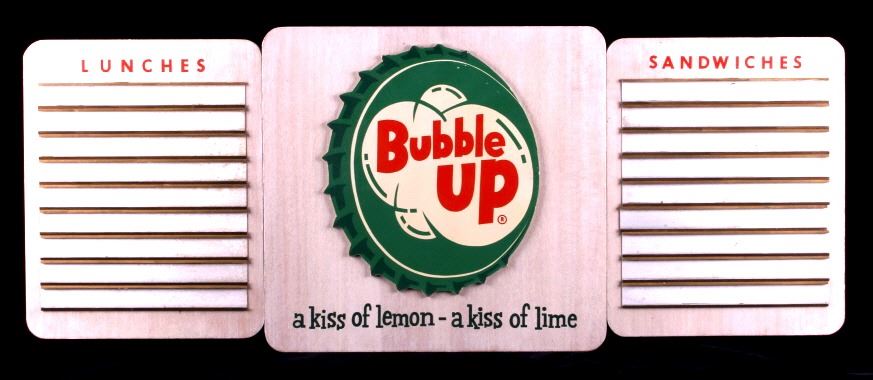 This is a Bubble Up menu display board from a diner. The display is made from wood and shows the Bubble Up bottle cap logo in the middle with the slogan "a kiss of lemon-a kiss of lime". The Bubble Up menu board is in good overall condition. It measures 19" x 47.5".