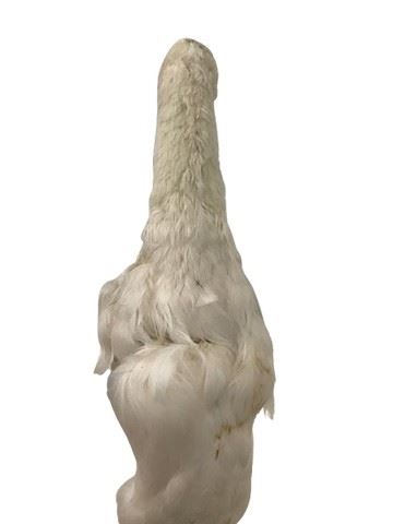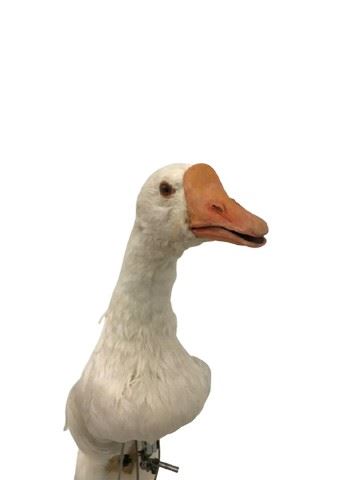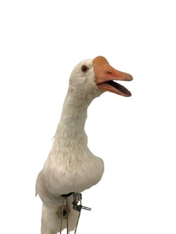 This lifelike, 19-inch Goose puppet head and neck (size simulated an actual goose) is a masterpiece of animation, designed by Dave Nelson of AnimatedFX, appeared in a Bubble Yum commercial of days gone past, moving and grooving . It is made of fiberglass, artificial fur, and feathers. It is controlled by internal rods and cables. It can perform a wide range of movements, from dancing to delivering long speeches. With its cable controlled, movable beak, rod controlled neck and head, plush neck, resin beak, and glass eyes, this puppet offers a remarkably realistic and expressive performance.