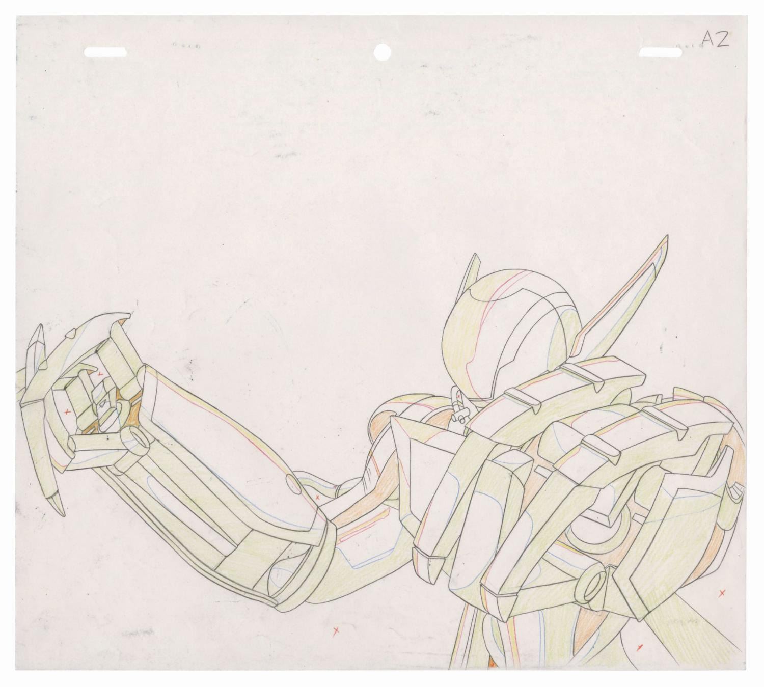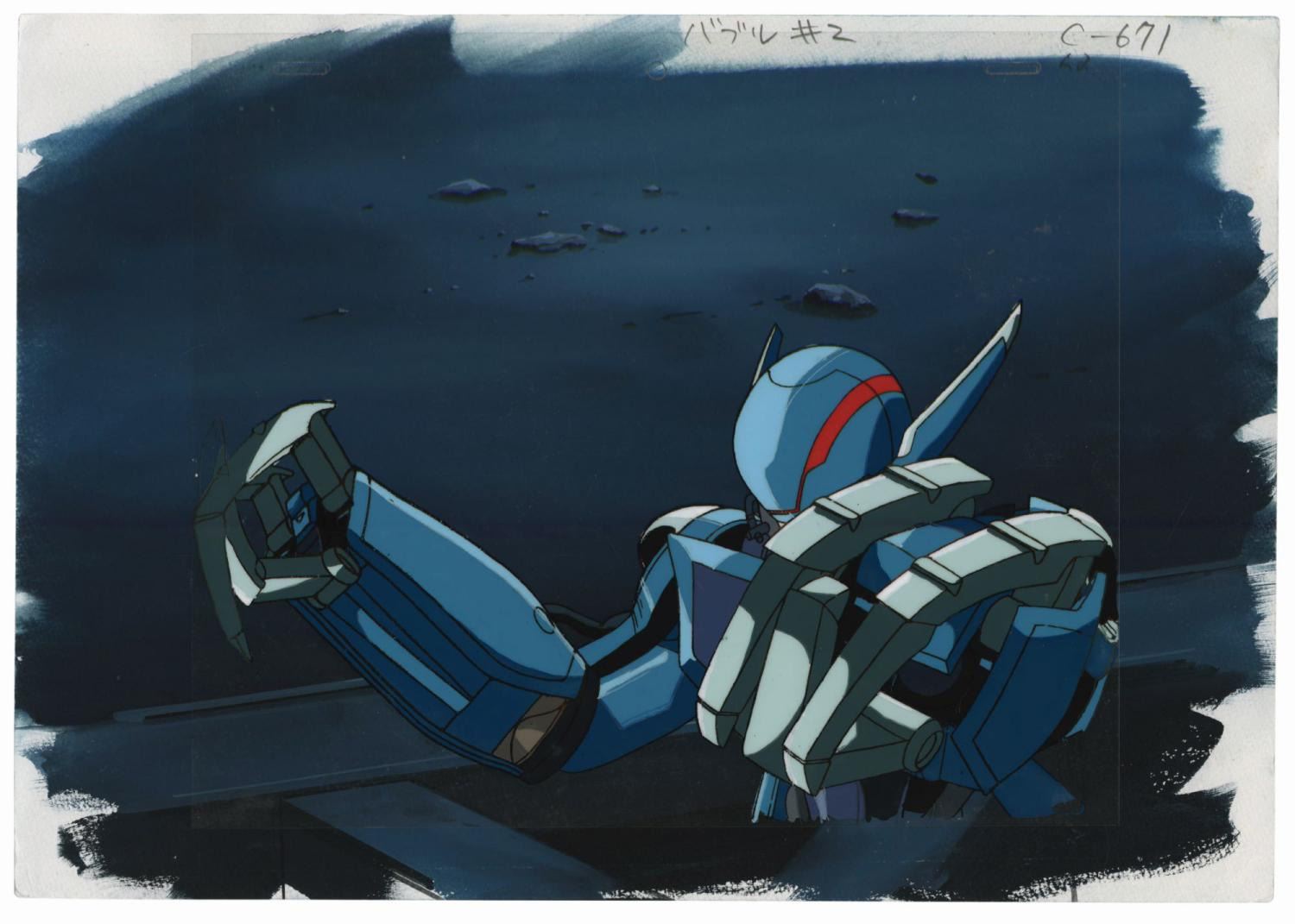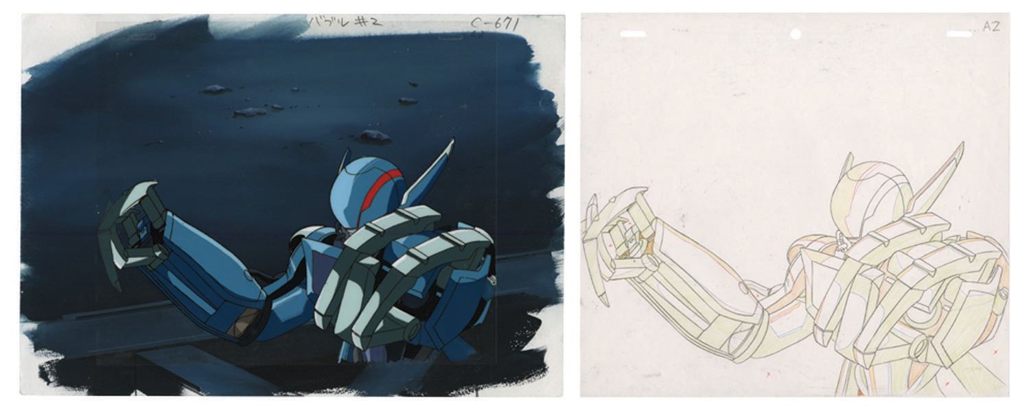 (AIC, 1991) An original production cel and background from the anime Bubblegum Crash. The cel features Priss in her mech suit from the episode "Geo Climbers," and is placed over a scene-matched hand-painted production background. An original production drawing is also included. The image measures 6"x10.5" on the 9"x10.5" cel, which is placed over the 10"x14.25" background. The condition is very good with a small spot of paint loss at the lower right, and some minor edge-wear to the background.