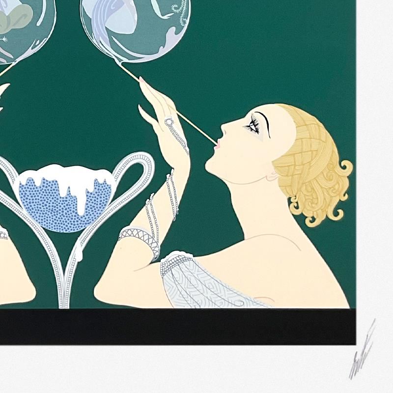 "Bubbles" is a limited edition serigraph on paper by Erte (1892-1990), numbered XIV/XL and hand signed by the artist. Includes Letter of Authenticity. Measures approx. 30" x 23.5" (border), 25" x 18.5" (image). Due to the age of this piece there are very minor flaws that are only noticeable upon close inspection.