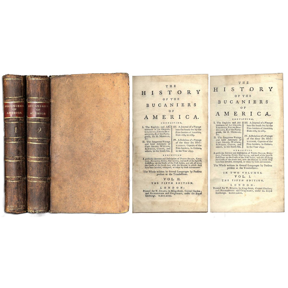 Exciting two-volume set of ''Bucaniers of America,'' a collection of eyewitness accounts of pillaging and plundering in the 17th century Caribbean and Central America. The memoir is by Alexandre O. Exquemelin, a French writer and barber-cum-surgeon to the famed Sir Henry Morgan, whose escapades as well as those of other high-seas merchants fill the book. Exquemelin, who participated in the 1697 Raid on Cartagena, originally wrote the book in Dutch in 1678; his accounts of Morgan as a bloodthirsty pirate precipitated a libel suit by Morgan to no significant effect however, other than cementing the popularity of ''Bucaniers'' in popular culture. It's now considered by historians as an important sourcebook of high-seas privateering at a time when bucaneers could capitalize upon the tense relations of the major European powers and their pre-colonial explorations. It has also influenced writers such as John Steinbeck, Ian Fleming and Peter Benchley. An excerpt from Volume I: ''…the guide of the canoes cried out…His voice caused infinite joy to all the pirates, hoping to find some provisions to satiate their extreme hunger. Being come to the place, they found no body in it, the Spaniards being fled, and leaving nothing behind but a few leathern bags, all empty…Being angry at this, they pulled down a few huts which the Spaniards had made, and fell to eating the leathern bags…Thus they made a huge banquet upon these bags of leather, divers quarrels arising concerning the greatest shares. By the bigness of the place, they conjectured about 500 Spaniards had been there, whom, finding no victuals, they were now delirious to meet, intending to devour some of them rather than perish…Captain Morgan knowing some of his men were now almost dead with hunger…'' Exquemelin later illustrates the truth of the idiom about thieves and honor, ''…those of our men, who had lost their money by gaming, put their cruel design in execution…and…I came to know that the warning formerly given to me was too true: for these wretches…hid themselves behind the rocks that are upon the brink of this river, by which we must necessarily pass…We went down the river at a distance from one another, and without any mistrust; they had but too much time and conveniency to pick out and murder five Englishmen, whom they knew to be some of the best furnished with booty…None of our people knew any thing of this murder; but…I told them what I had seen, which was fully confirmed, as well as by the absence of the dead men, as by that of the assassins, who durst not come and rejoin us, and whom we never saw from thence forward…'' Two volume set is bound in leather with gilt lettering and ribbed spines. This copy is the fifth edition, printed ''for T. Evans in King-Street, Covent Garden, and Richardson and Urquhart, under the Royal Exchange'': London: 1771. Volume I and II runs 318 and 359 pages respectively and each measures 4†x 7â€. Both volumes show chipping to the board corners and general wear as one would expect for their age. Overall in attractive, very good condition.