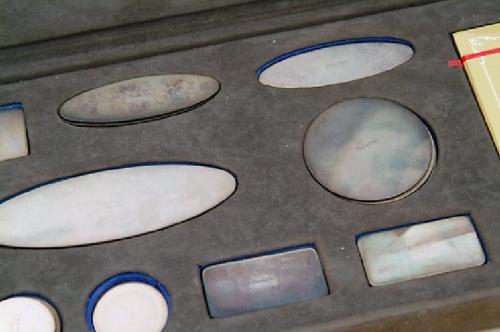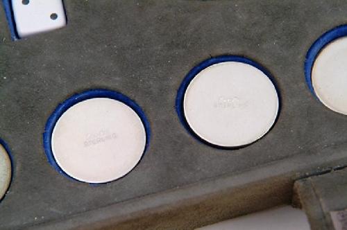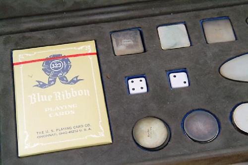Buccellati (Italy) Sterling Silver, 17 1/2" by 5 1/2" by 1 1/8" 3.5 pounds of sterling silver chips, 40 small round 20 small rectangular 30 small square, 20 small oval, 5 large round, 10 large oval, 2 decks of cards, one pair of dice, Limited edition