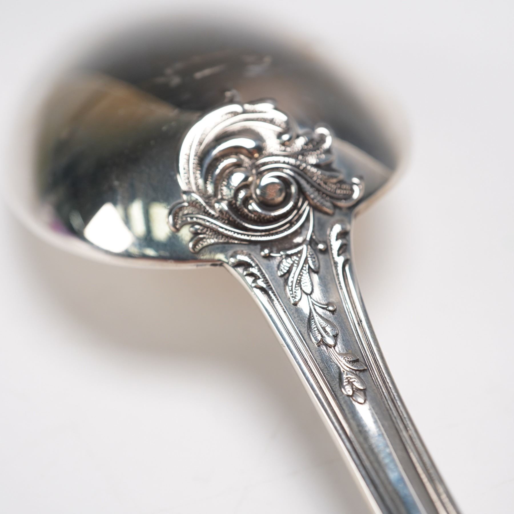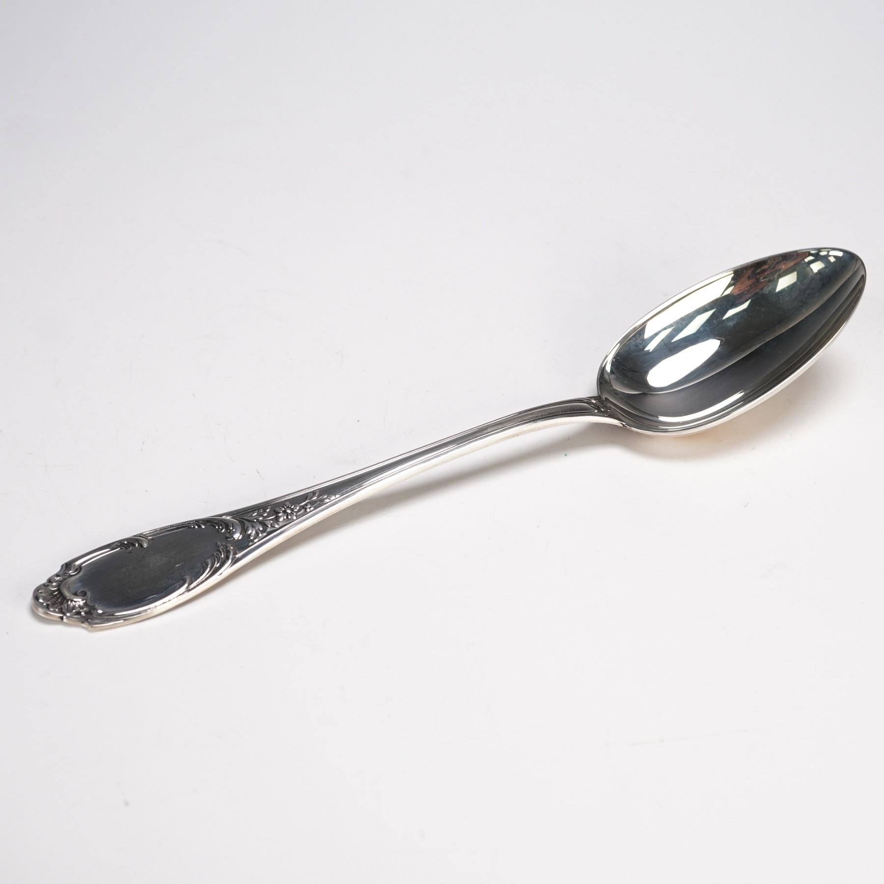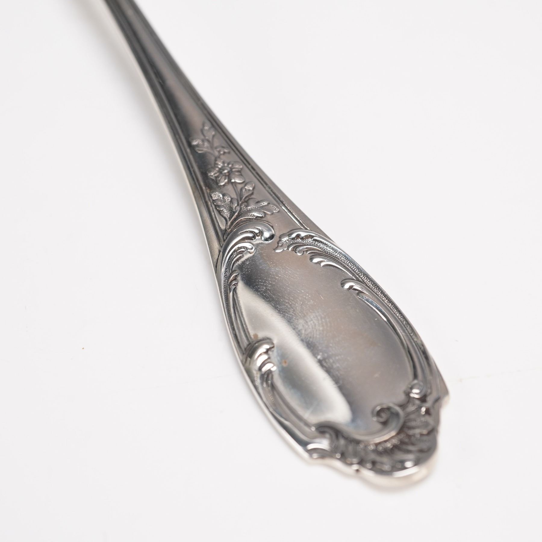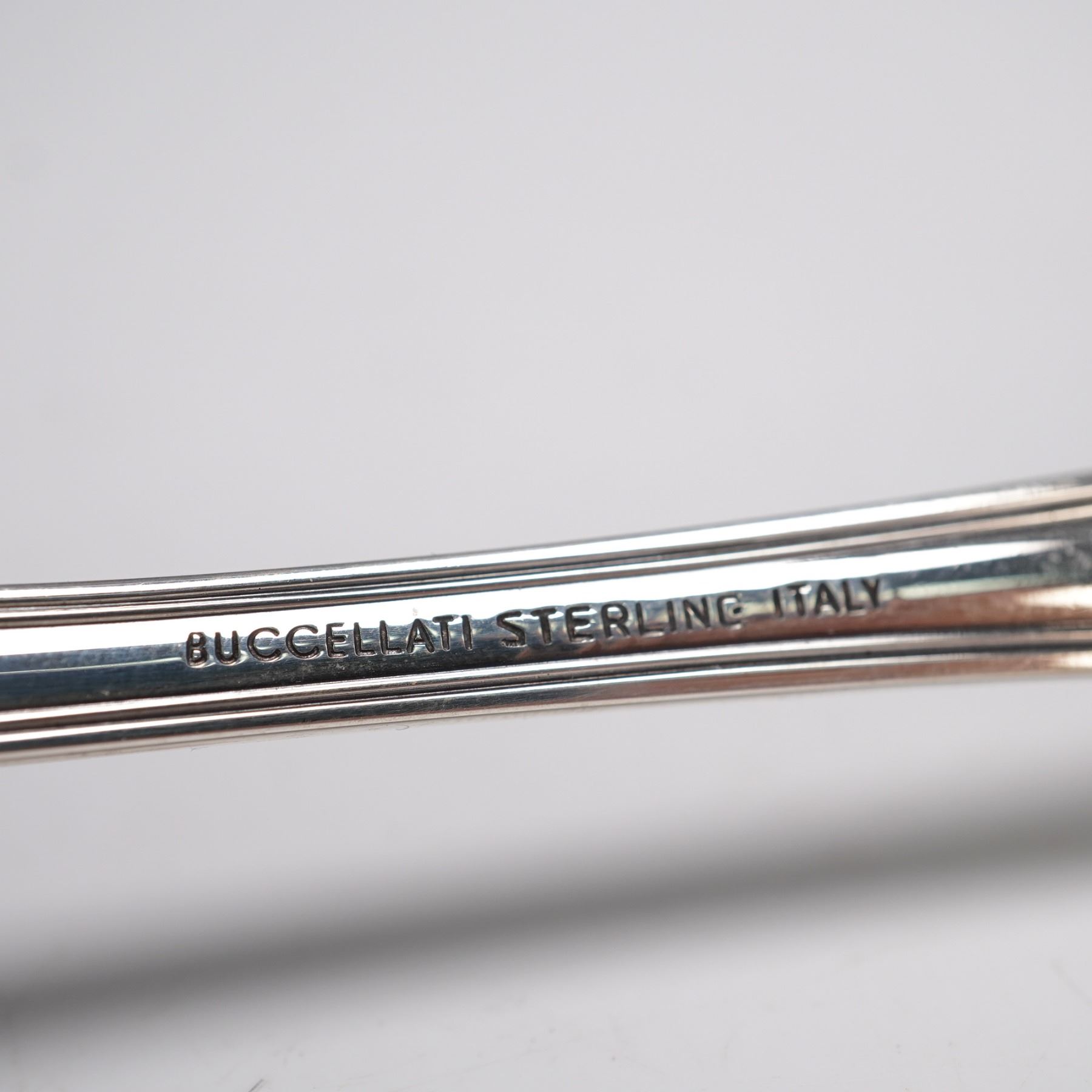 In the luxurious Monte Mario pattern by Buccellati, introduced in 1996. Crafted in sterling silver and featuring a richly detailed floral and scroll motif with an elegant blank cartouche at the handle. Marked Buccellati Sterling Italy on the reverse. Net silver weight: approximately 2.18 troy oz.