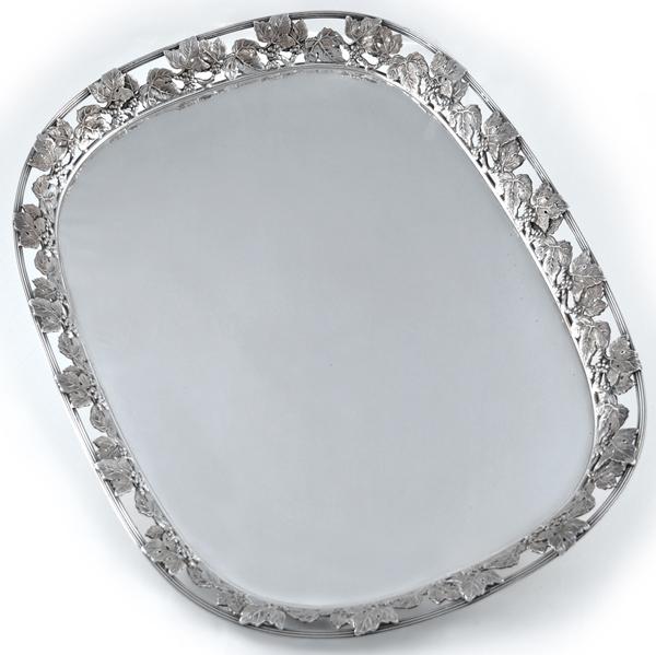 Italian sterling silver tray by Buccellati designed with a reticulated gallery showing a hand chased grape on vine motif, 43.59 troy oz.