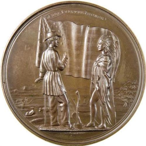 <B>1857 James Buchanan Indian Peace Medal, Julian IP-36, MS62 Uncertified.</B></I> Bronzed copper, 75.5 mm, 260.0 gm, rim 7.4 mm. Obverse: That of IP-34. Bust right, JAMES BUCHANAN, PRESIDENT OF THE UNITED STATES, date 1857 below. Signed S. ELLIS SC. for sculptor Salathiel Ellis. Reverse: That of IP-30. Settler lectures Indian "on the benefits of civilization" (Julian). Above, LABOR, VIRTUE, HONOR. J. WILLSON (for Joseph Willson) in exergue. The reverse die was reused from the Fillmore and Pierce Indian peace medals, as no new die was available until 1862, by which time Lincoln was president. <BR> The smooth, glossy surfaces are milk-chocolate-brown on this piece, with muted mint red around some of the peripheral lettering. A patch of luster grazes is noted in the right obverse field, along with a few verdigris spots on that side. The reverse is choice, despite the presence of minute contact evidence and an old, faint fingerprint.<BR><BR><b>Shipping:</b> Coins & Currency (<a target="_blank" href="http://www.heritageauctions.com/common/shipping.php">view shipping information</a>)