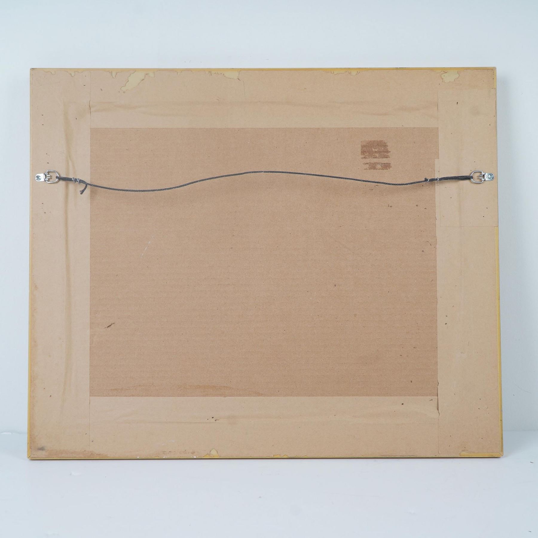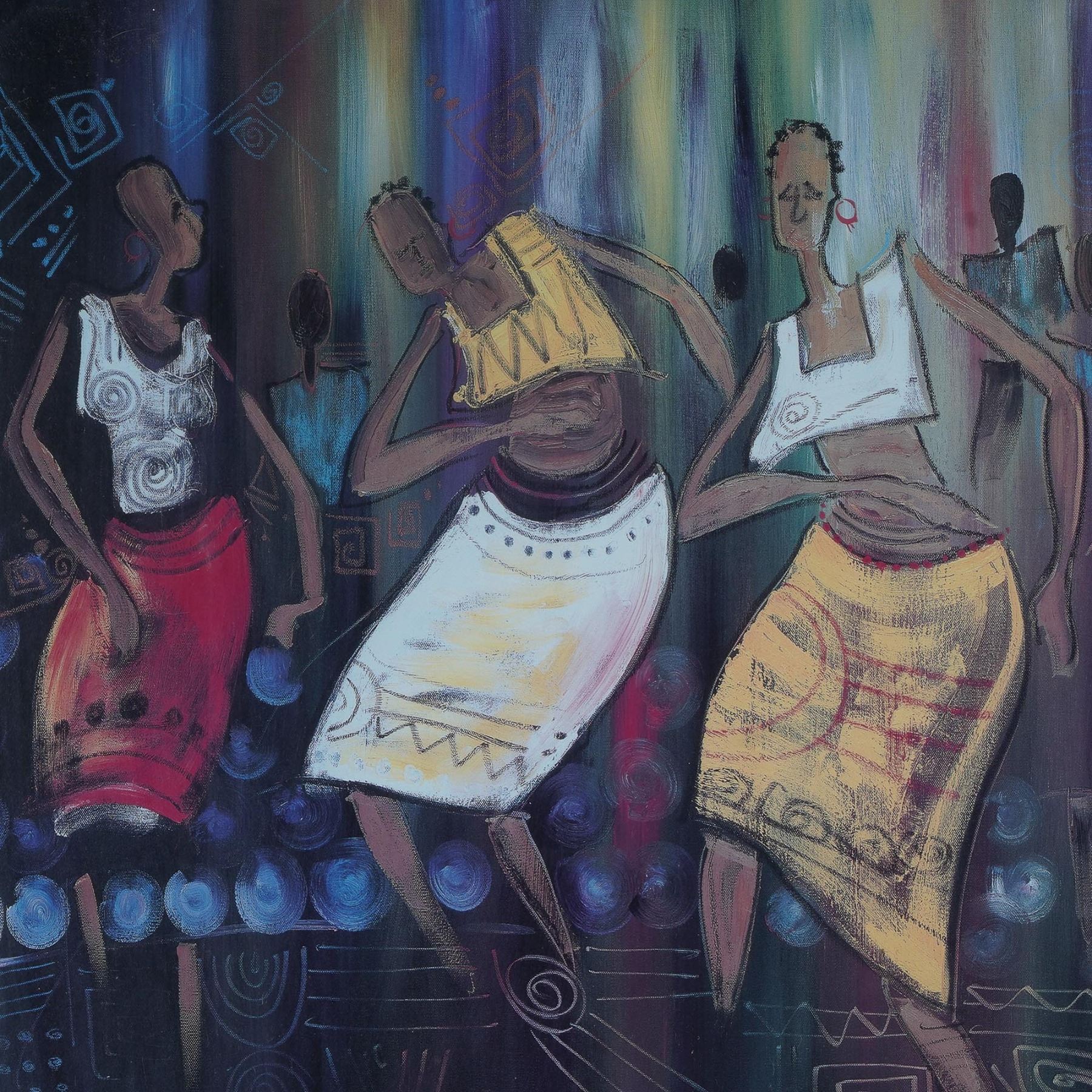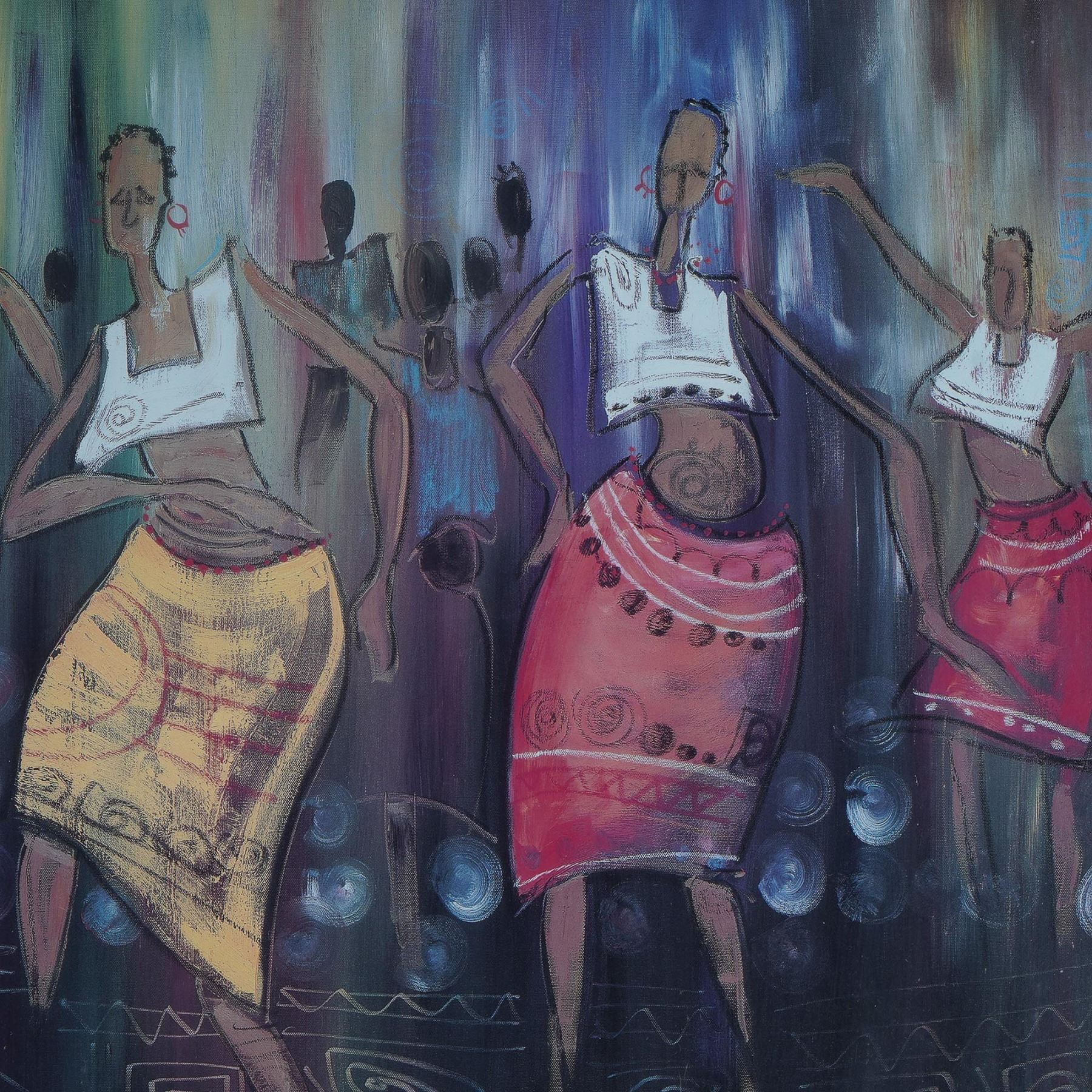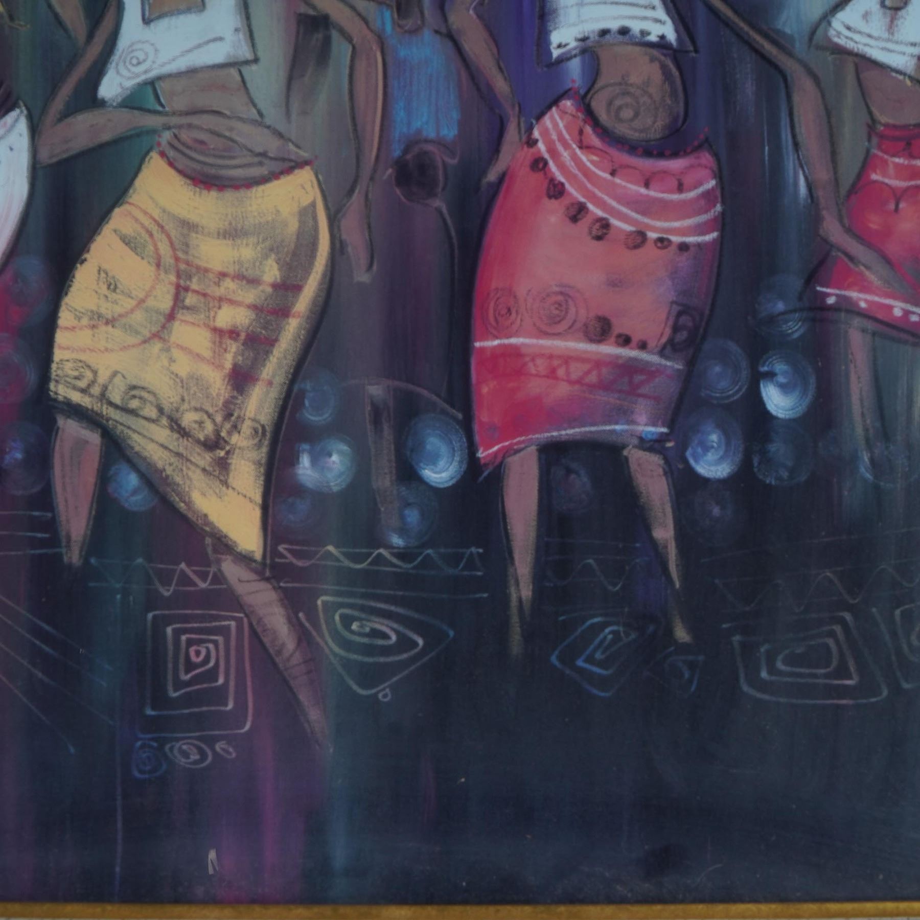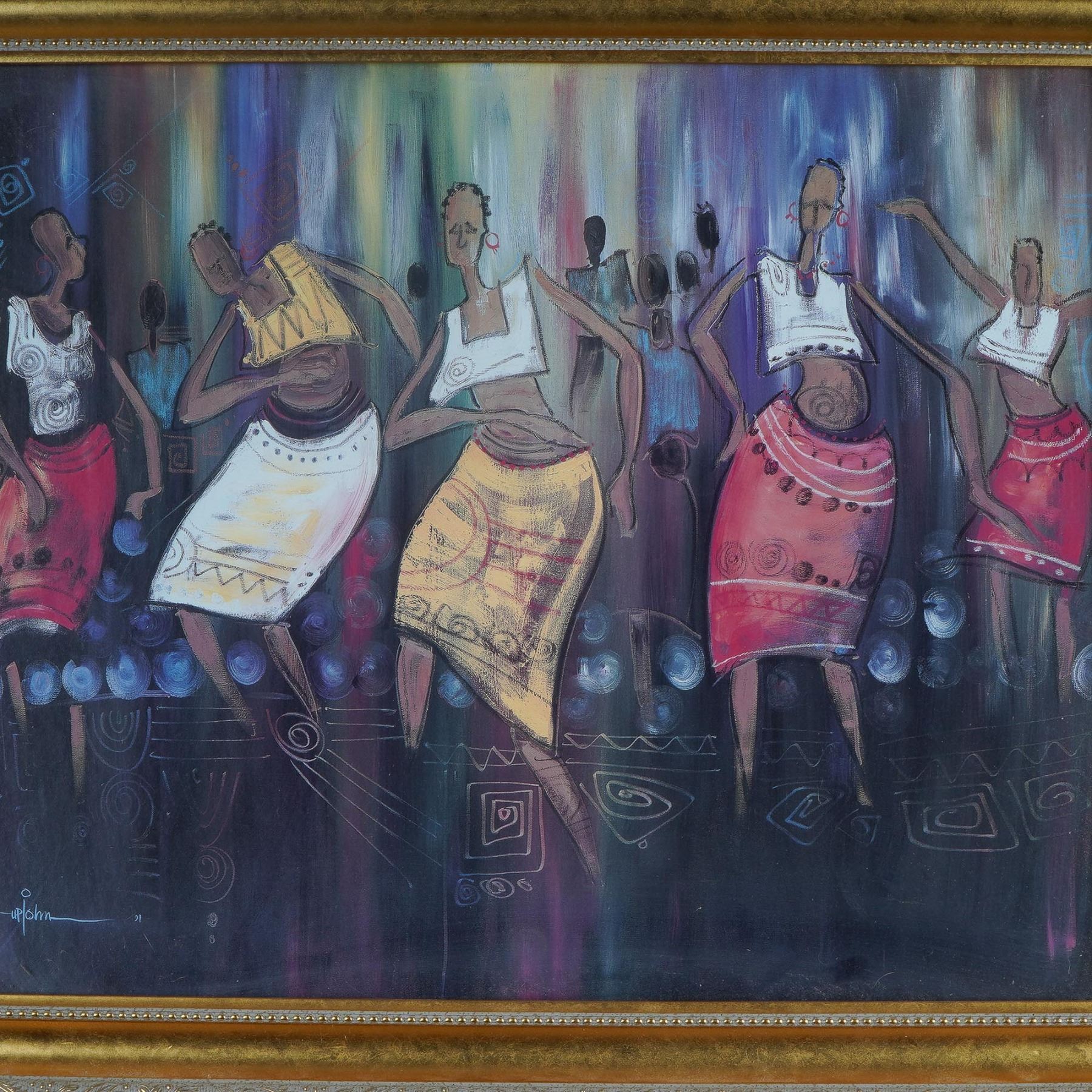 Vibrant and expressive giclee print titled African Dancers by Nigerian artist Buchi Upjohn. The composition features a dynamic group of African women dancing in colorful attire, captured mid-motion with fluid lines and vivid color. Set against an abstract, rhythmically layered background, the piece reflects cultural celebration and movement. Signed in the print Upjohn at lower left. Presented in a decorative gold-tone frame with floral and beaded detailing. Wired and ready to hang.