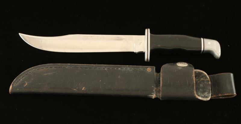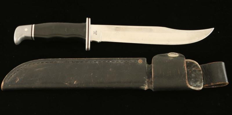 Black synthetic handle measures 12 ' overall 8" blade and leather Buck brand sheath.