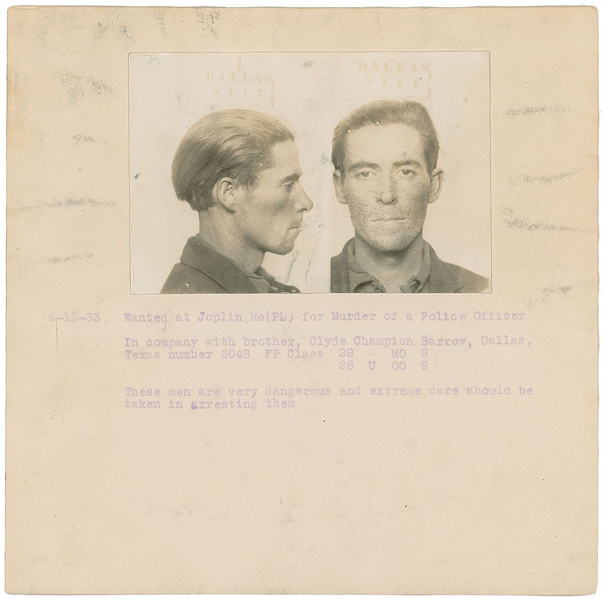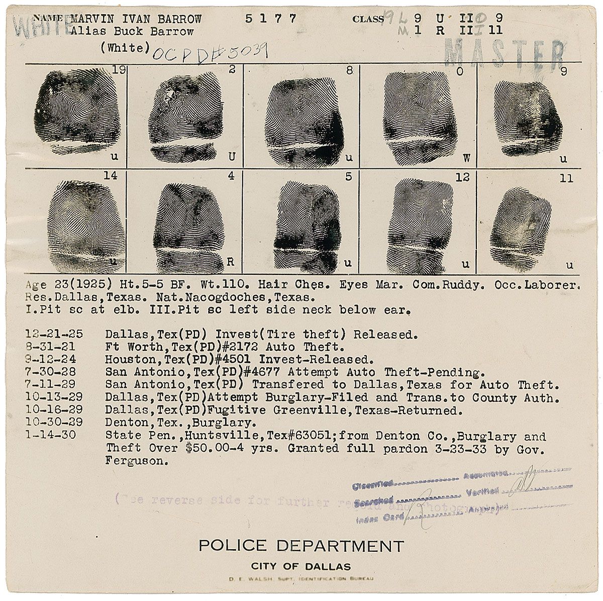 Older brother of Clyde Barrow and member of his gang (1903–1933). Original vintage 8 x 8 photographic master copy of Barrow’s Dallas Police Department fingerprint card and mug shot, produced circa April 1933. One side features ten images of his fingerprints and a detailed criminal record through January 14, 1930, and the other side bears an affixed 4.75 x 3.25 mug shot and a typed notation below that reads, in part: “4-13-33. Wanted at Joplin, MO (PD) for Murder of a Police Officer. In company with brother, Clyde Champion Barrow…These men are very dangerous and extreme care should be taken in arresting them.” In fine condition, with expected handling wear and slight rippling to edges. On April 13, the Barrow brothers and gang member W. D. Jones participated in a shootout with Joplin law enforcement, killing a constable and detective. The gang engaged in multiple other gunfights over the course of the next few months, including the murder of a marshal, this time in Arkansas. In late July, however, Buck was seriously injured on separate occasions in late July and succumbed to his wounds in an Iowa hospital shortly thereafter. An incredible, unique law enforcement item issued in the effort to apprehend an intimate associate of the most notorious gangster of all-time.