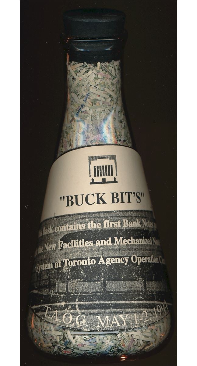 Buck Bit's; Flask containing the First Bank Notes processed through the New facilities and Mechanized Note processing sytem at the Toronto Agency Operation Centre.