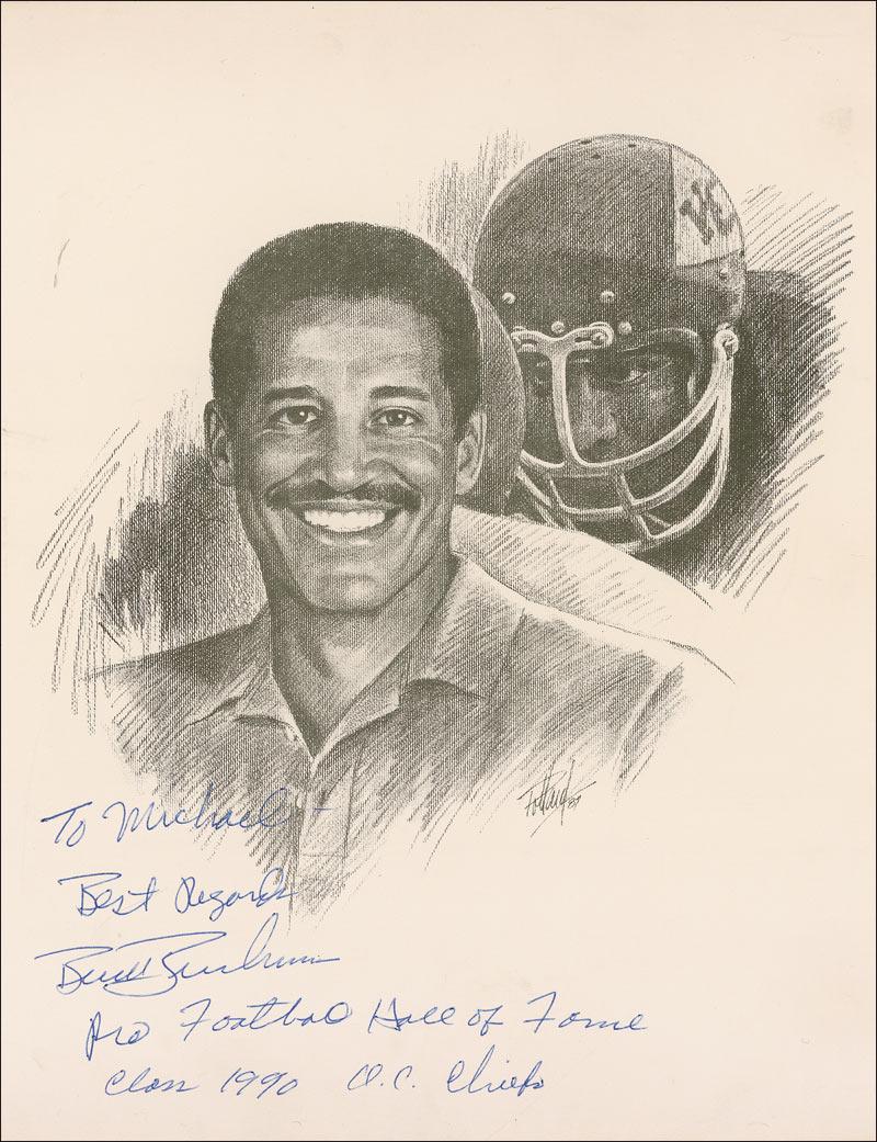 Pro Football Hall of Famer (1940–1992). Composite print, 8.5 x 11, of Buchanan in and out of uniform, signed and inscribed in blue ballpoint, “To Michael, Best regards, Buck Buchanan, Pro Football Hall of Fame, Class 1990 K.C. Chiefs.” In fine condition, with some light creases along right edge.
