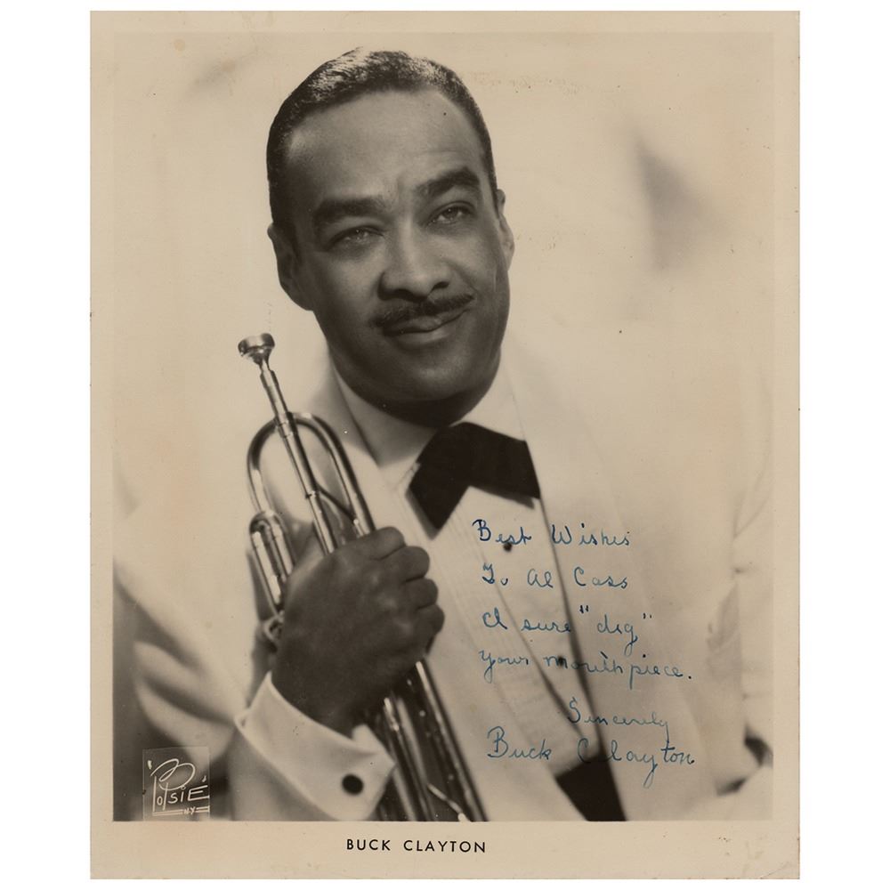 Vintage glossy 8 x 10 photo of Clayton by Popsie Randolph, signed and inscribed in fountain pen to the noted inventor and brass mouthpiece manufacturer, "Best wishes to Al Cass, I sure 'dig' your mouthpiece. Sincerely, Buck Clayton.†In fine condition. In addition to Clayton, Cass counted the likes of Dizzy Gillespie, Louis Armstrong, Roy Eldridge, Harry Sweets Edison, Booker Little, and Blue Mitchell among his top clientele. Cass's 'Fast' valve, key, and slide oil continues to be manufactured and sold to this day.