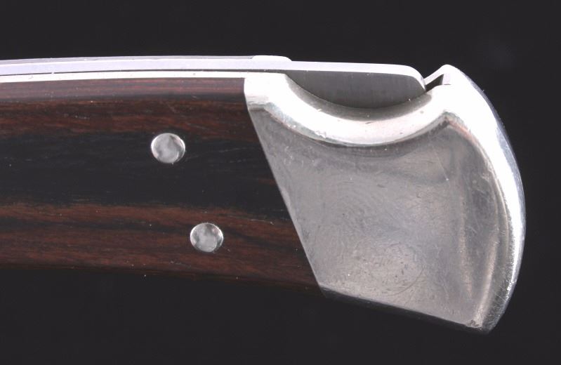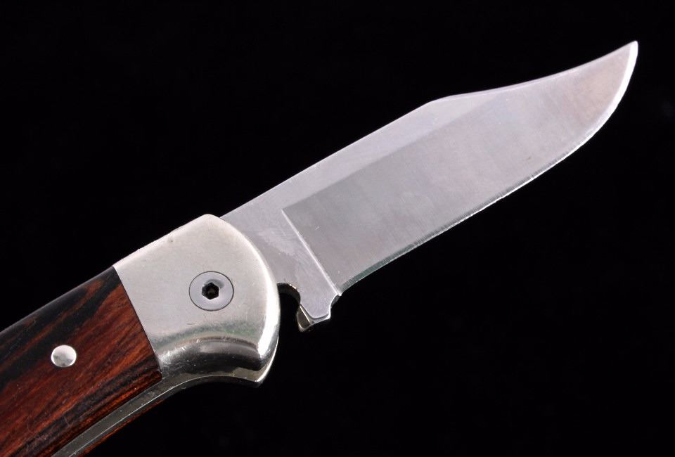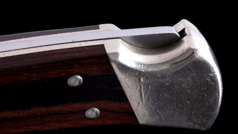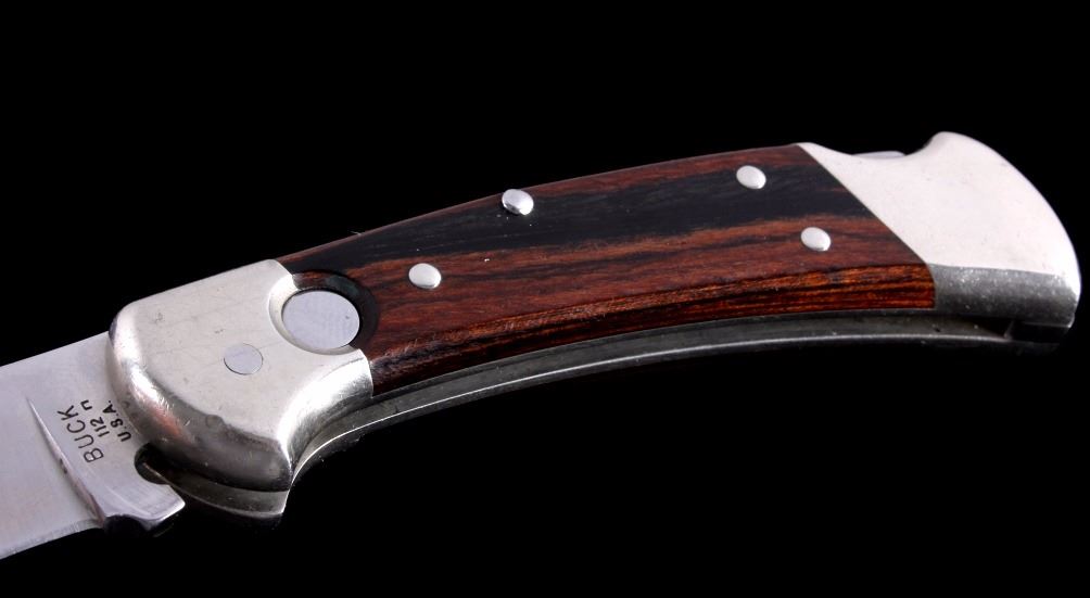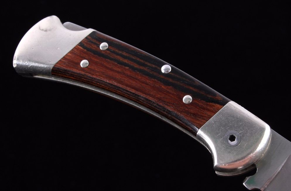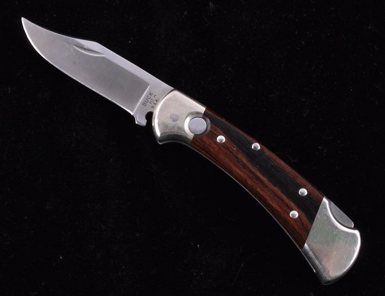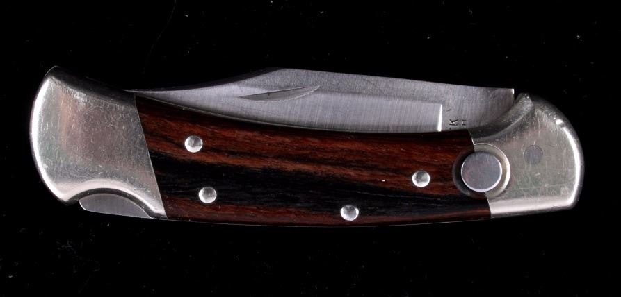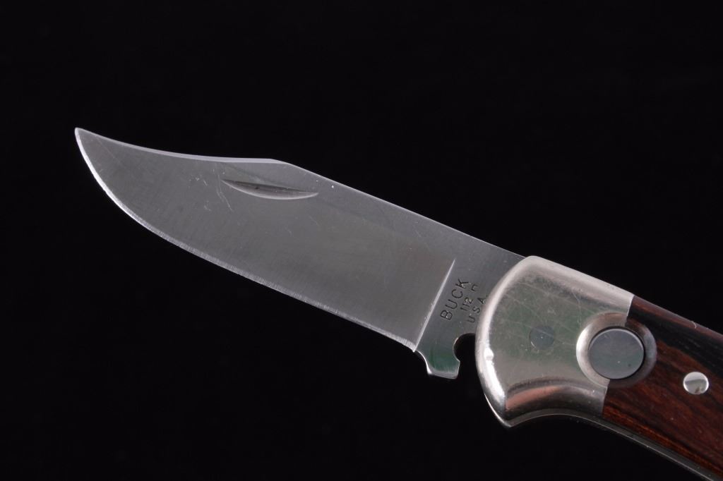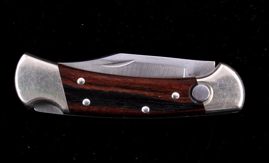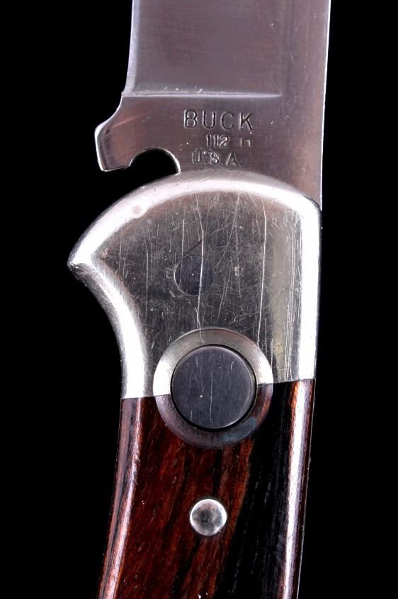 This is a Buck Custom 112 folding switchblade knife. The blade is marked "Buck 112 n U.S.A." and features a beautiful wooden handle. A button near the end of the handle releases the blade. The release to fold the blade in is at the opposite end of the handle. The knife is in good condition. It measures 7.25" with a 2.75" blade.
