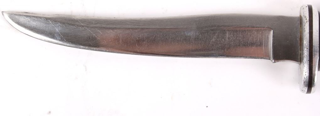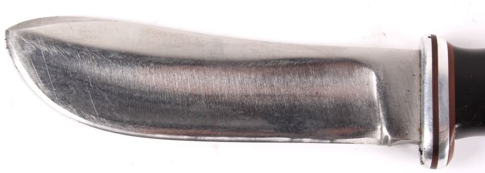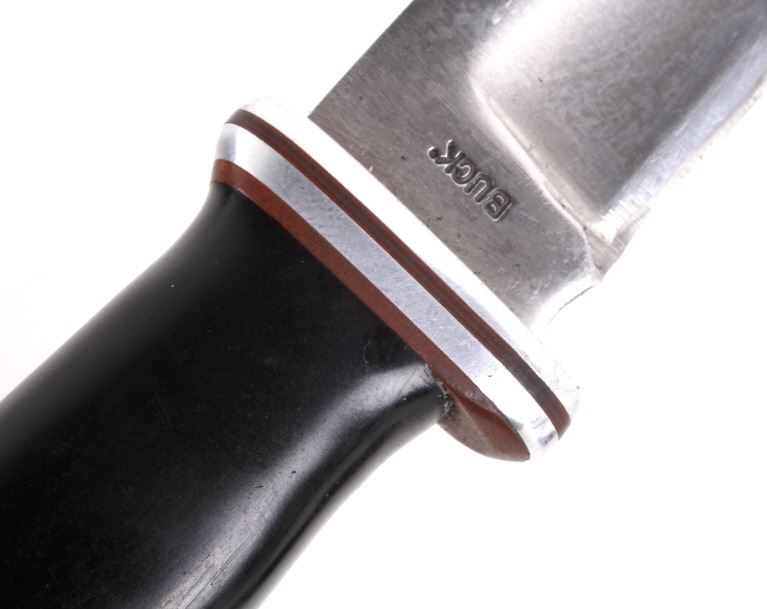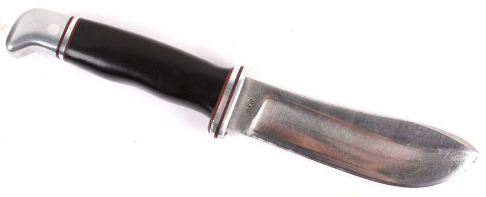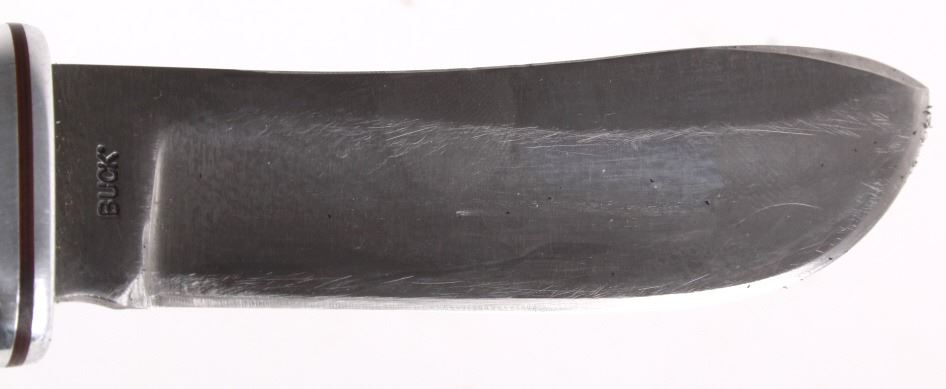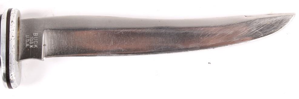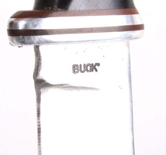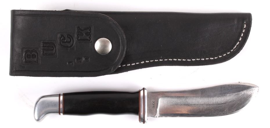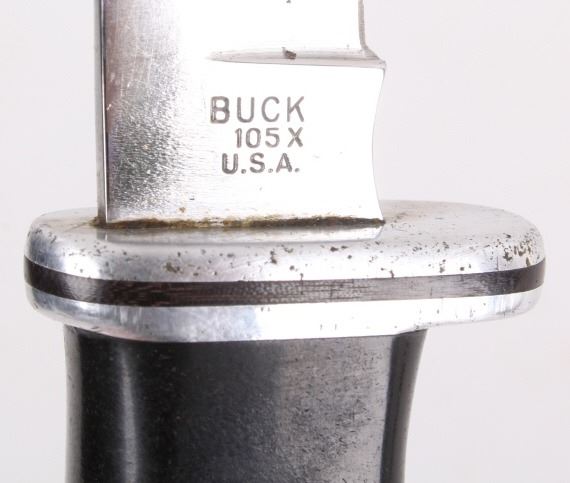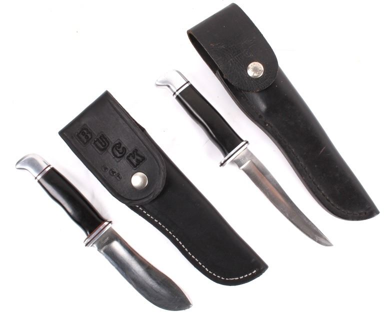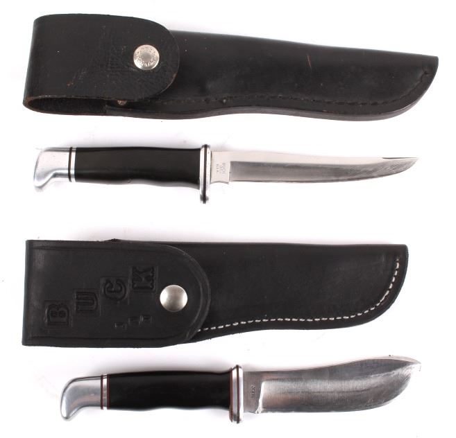 This is a pair of Buck hunting knives with sheaths. The knives feature two sheaths, one being original and the other custom of equal quality. The knives are marked "Buck and Buck 105 x U.S.A." and the sheaths are marked "105 and Buck AAT." These knives and sheaths are in good condition. The knifes measure 8 1/4" L x 4" blade length and 9 1/4" L x 4 1/2" blade length.
