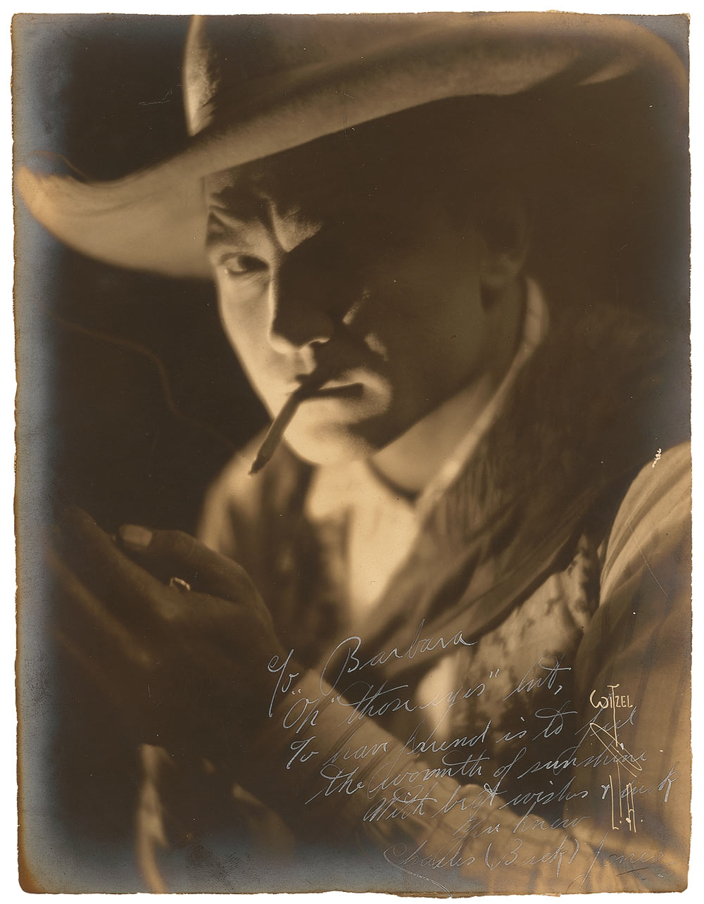 Cowboy film star (1889–1942). While visiting Boston on a 1942 war bond tour, Jones was invited to join some friends at the trendy Cocoanut Grove nightclub. When a fast-moving fire broke out, panicky patrons stormed the inadequate exits. For years, legend held that Jones's fatal injuries were the result of his going back into the burning building to save victims, but it is now known that he was trapped in the fire. Vintage matte-finish 7 x 9 photo of a shadow-drenched Jones lighting a cigarette, signed and inscribed in ink, “To Barbara, ‘Oh those eyes’ but, To have friend is to feel the warmth of sunshine, With best wishes & luck, You know, Charles (Buck) Jones.” In very good condition, with light, scattered surface marks, trimmed edges, a uniform border of silvering, and light contrast to the signature.